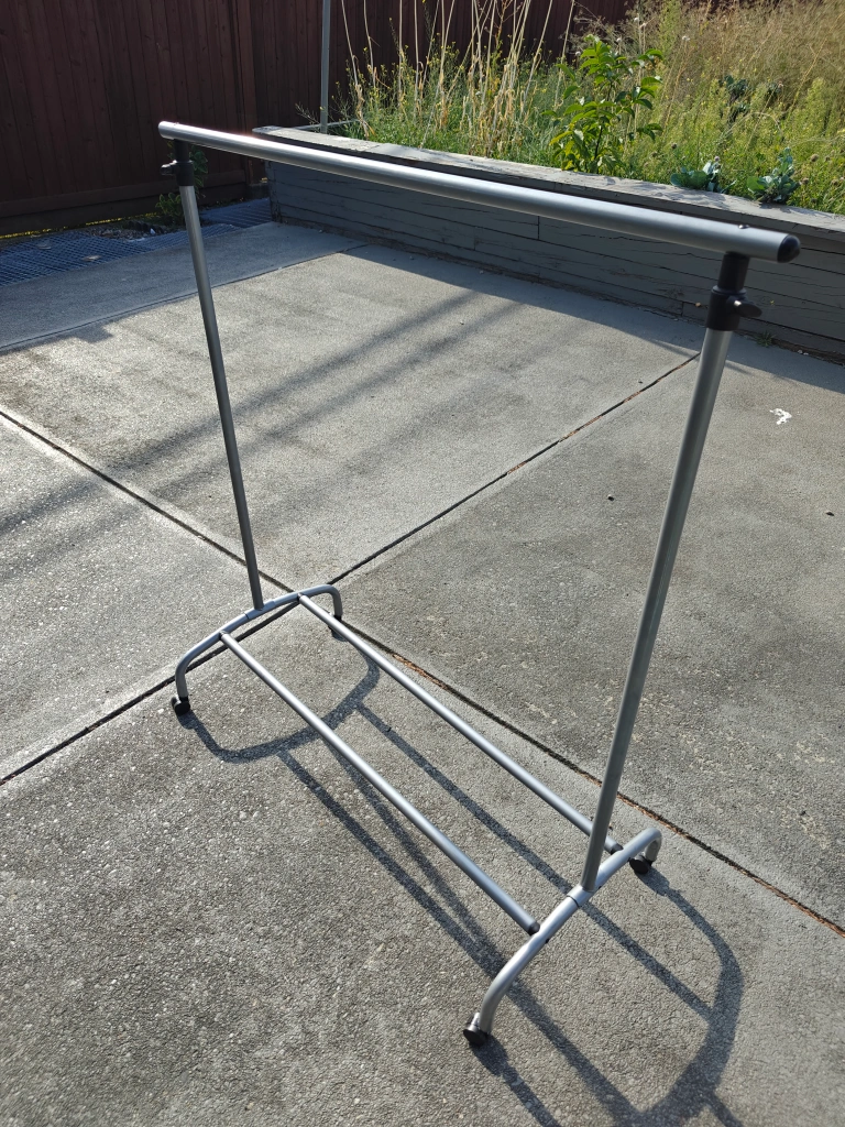 Selling a clothes rack in great condition! It's perfect for adding extra hanging space in your closet or for setting up a temporary wardrobe. The height is adjustable, and it's easy to move around thanks to the wheels. It's a simple and practical solution for organizing your clothes