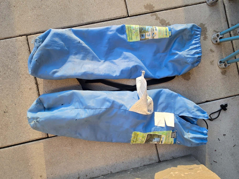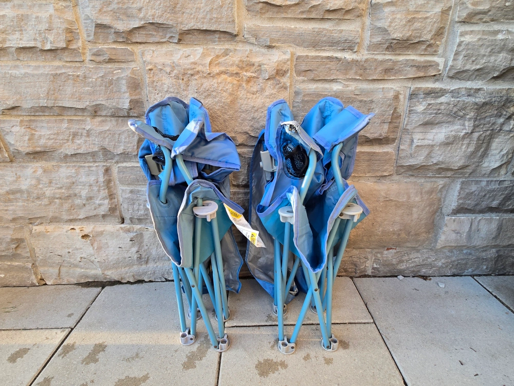 15Two blue camping chairs, each with its own canopy! Perfect for the beach, park, or backyard. They fold up for easy transport and storage. Great for staying cool and shaded on sunny days