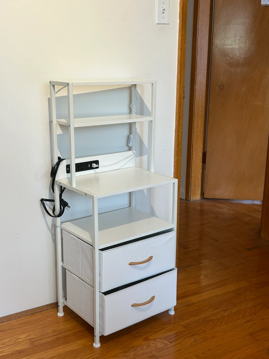 Here's a handy white shelf unit with drawers! It's perfect for adding some extra storage and display space to any room. It features open shelving and two drawers with cute wooden handles. Great for organizing your essentials!