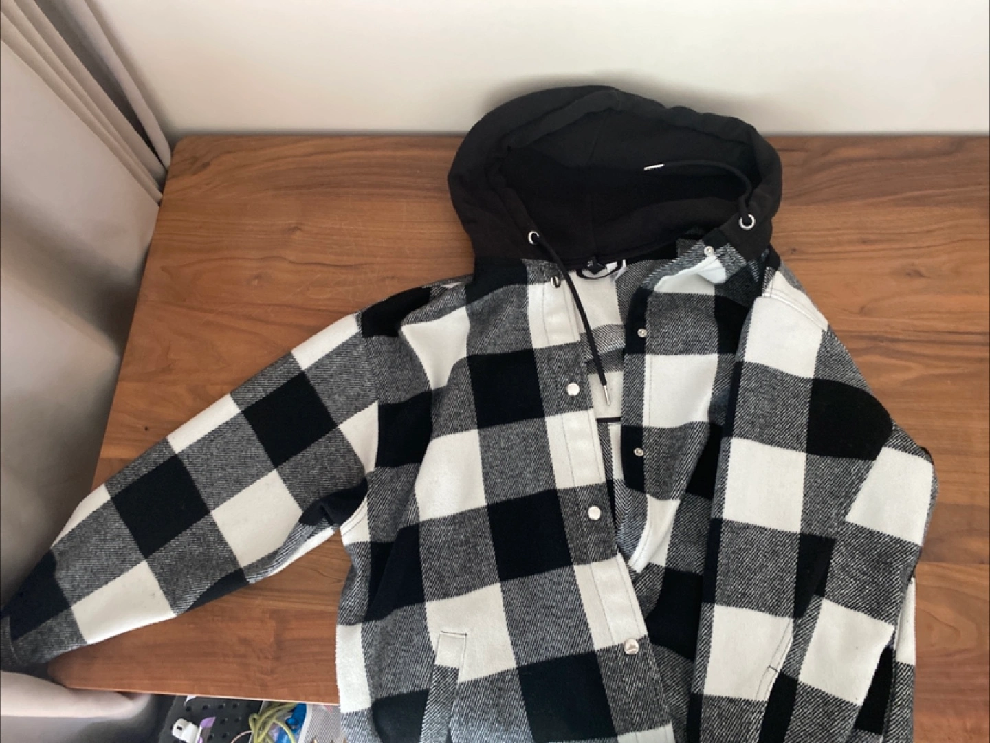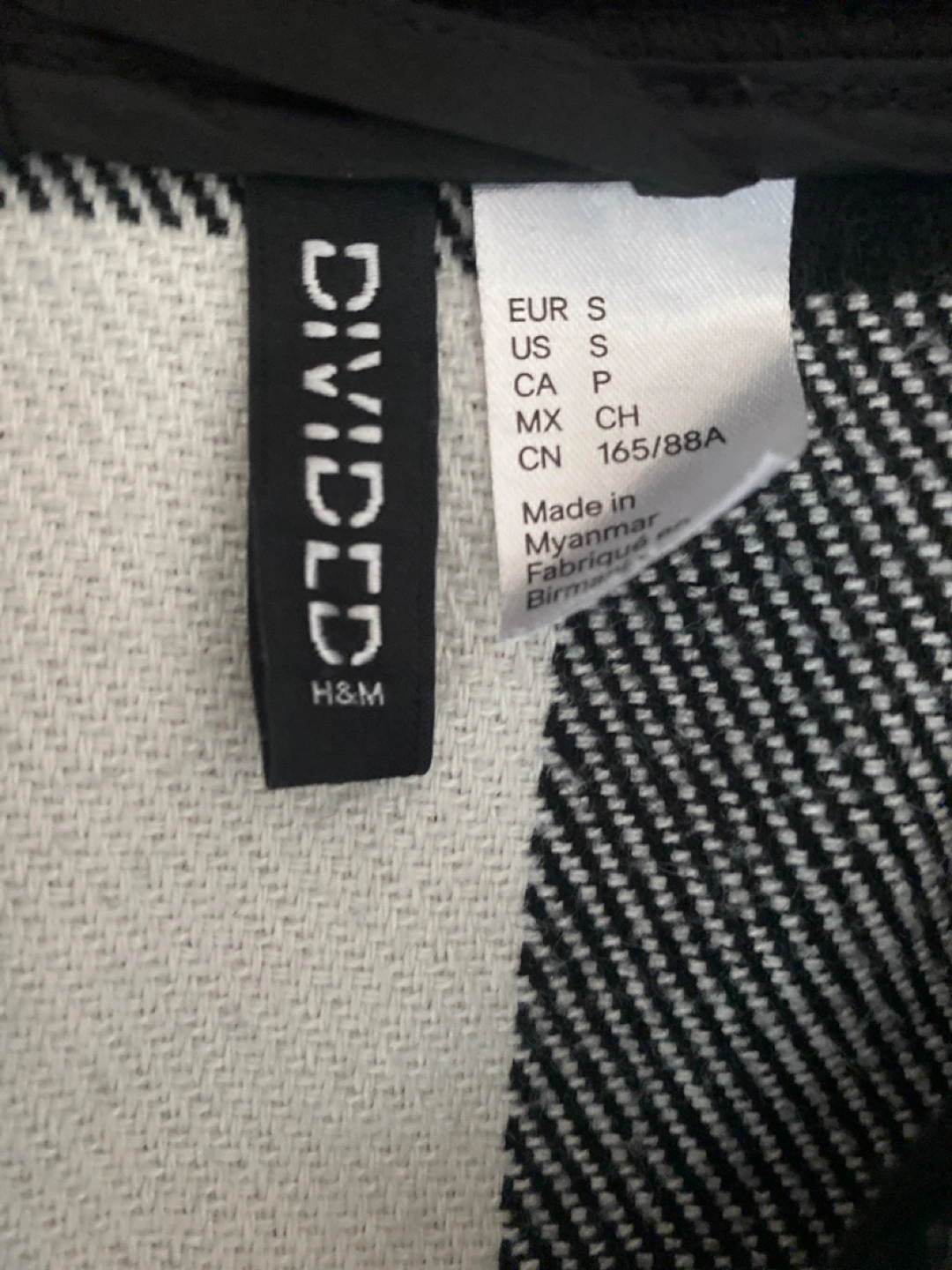 Cozy H&M Divided jacket with a classic black and white plaid pattern. It's a size small and features a hood for extra warmth. Perfect for layering during the cooler months!