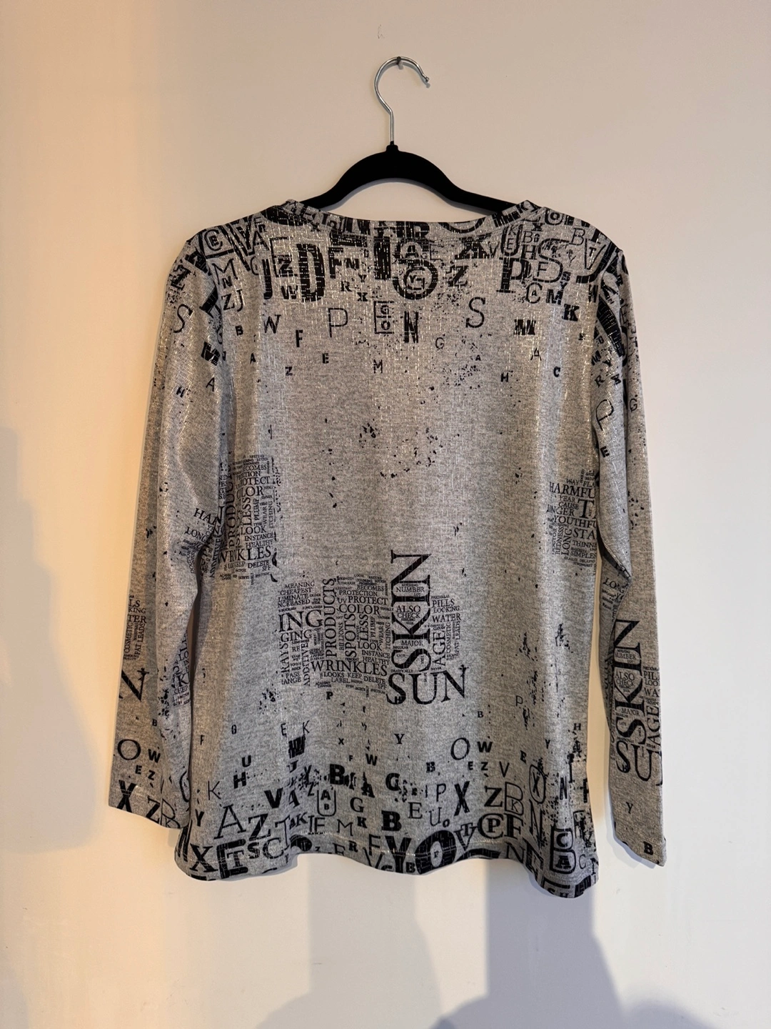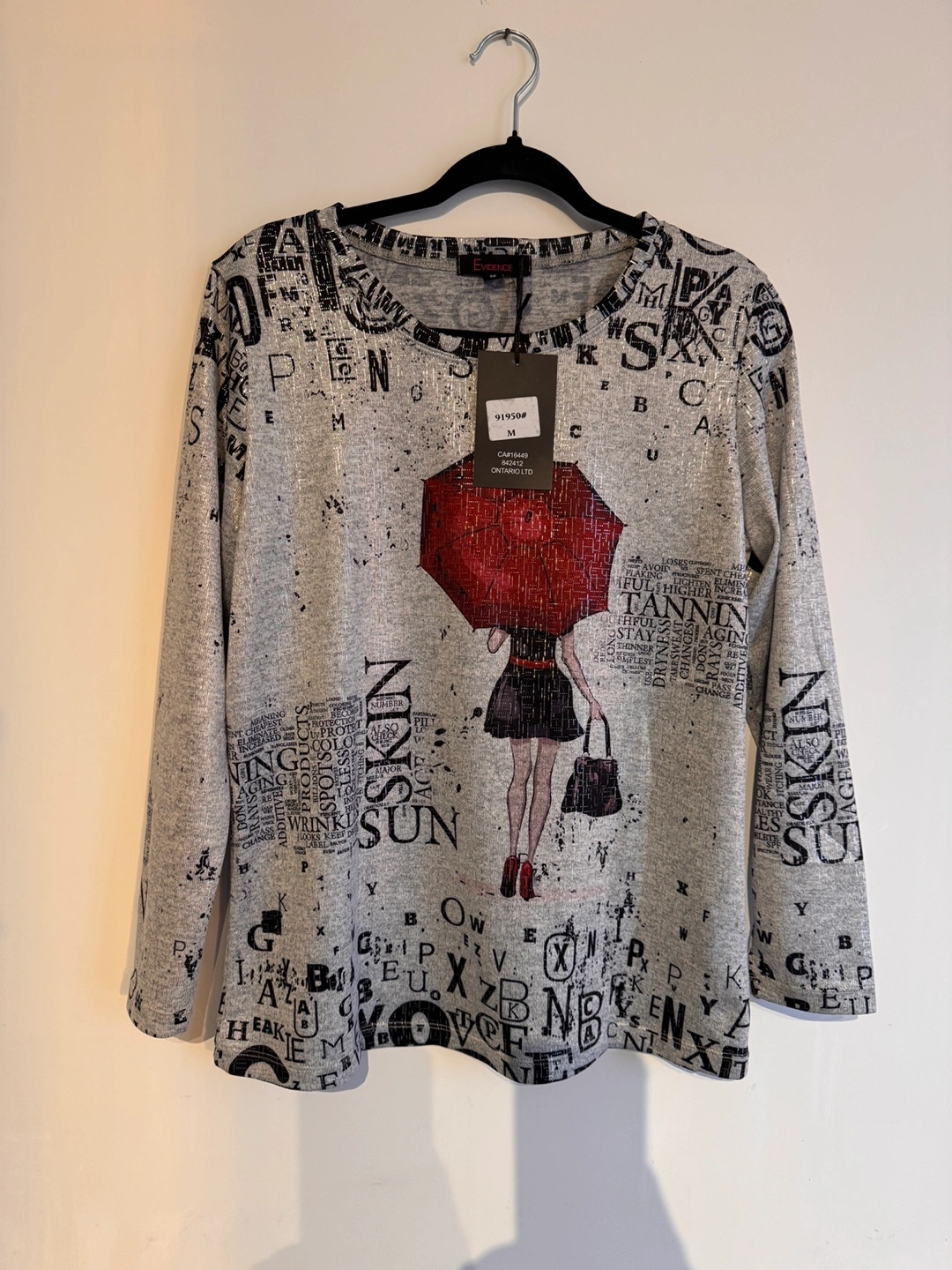 628This is a long-sleeved top from Evidence. The size is M. It has a unique design with letters and a red umbrella graphic. Perfect for adding a bit of flair to your wardrobe!