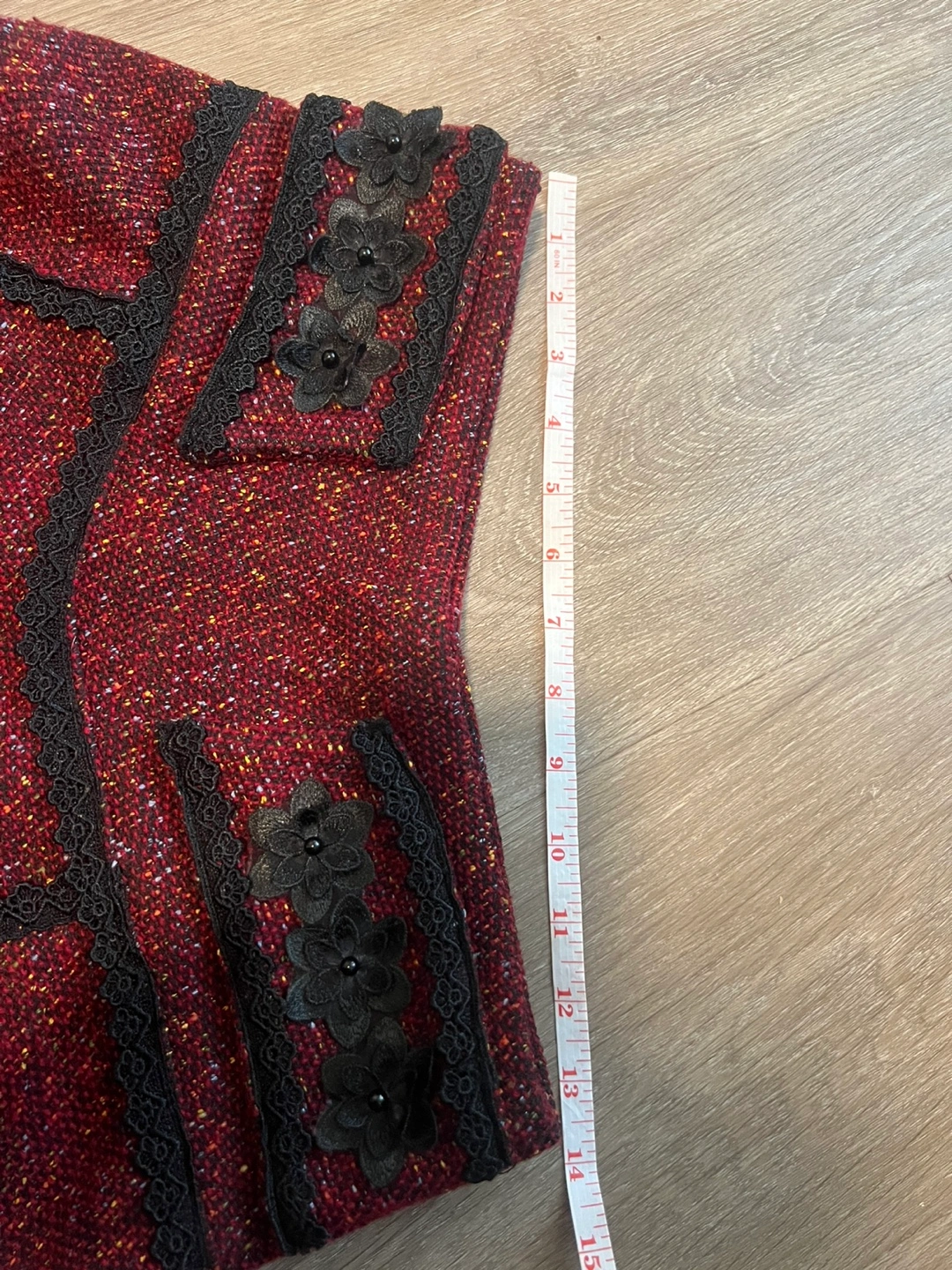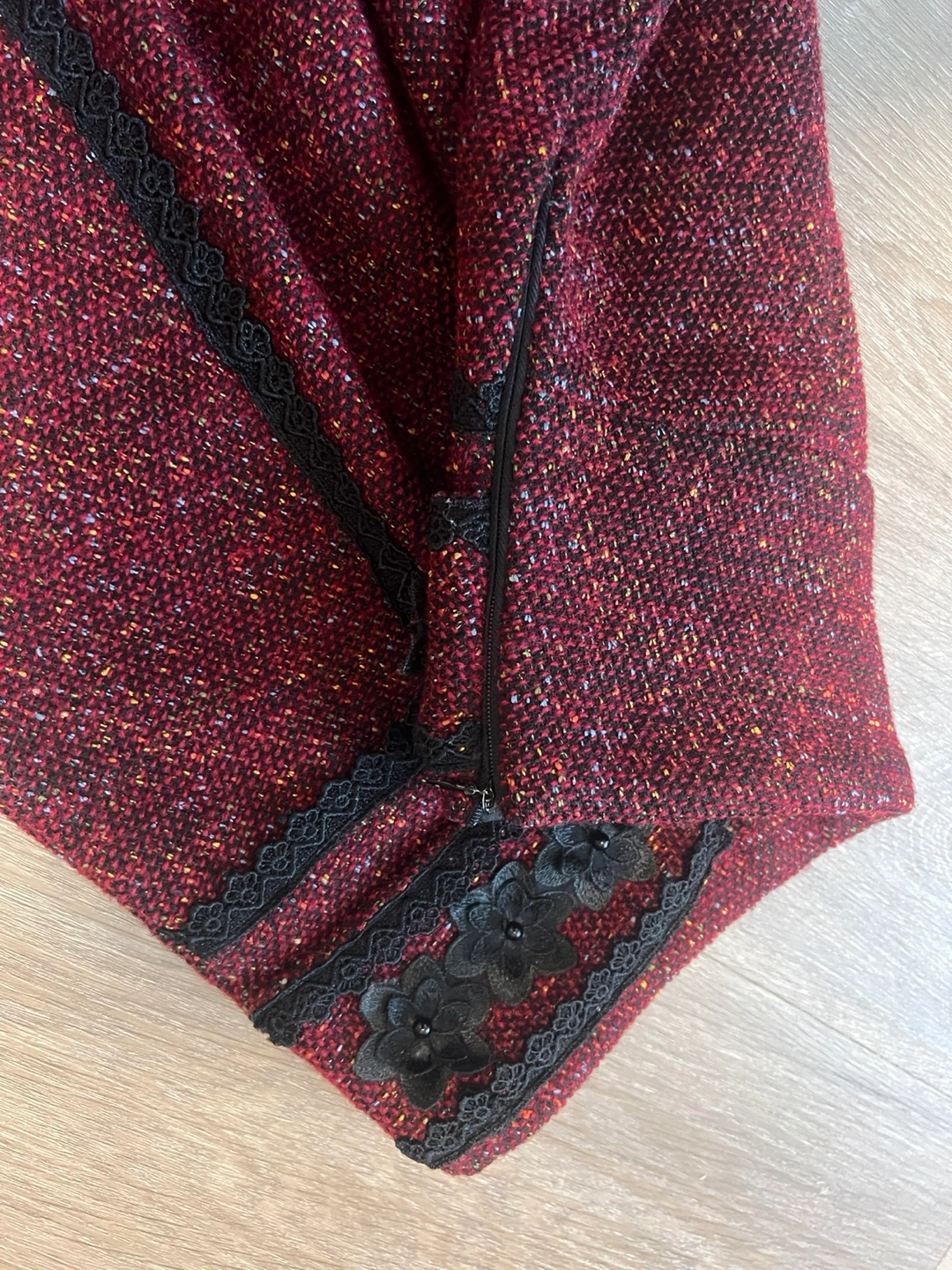 This is a lovely burgundy tweed skirt with black lace trim detailing. Warm Autumn skirt. In photos look small actually not. Not worn , now doesn’t fit me.