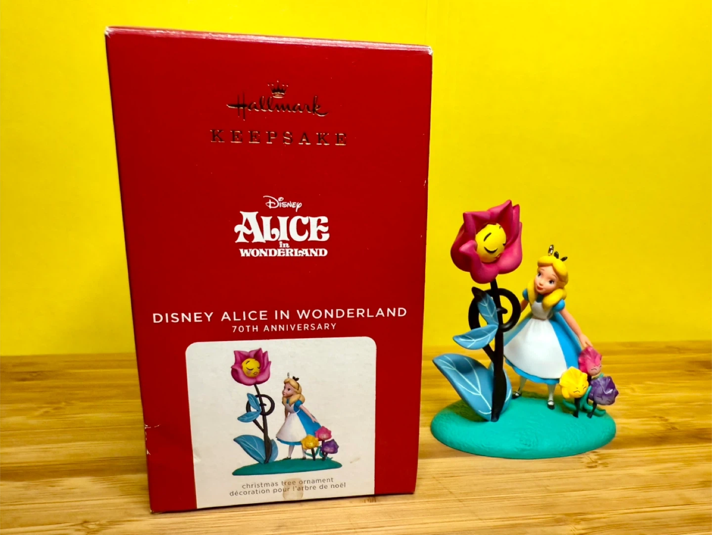 Selling a 2021 Hallmark Keepsake Disney Alice in Wonderland 70th Anniversary Christmas tree ornament. This is a rare collectible ornament and is in perfect condition. Come with the original packaging and box.