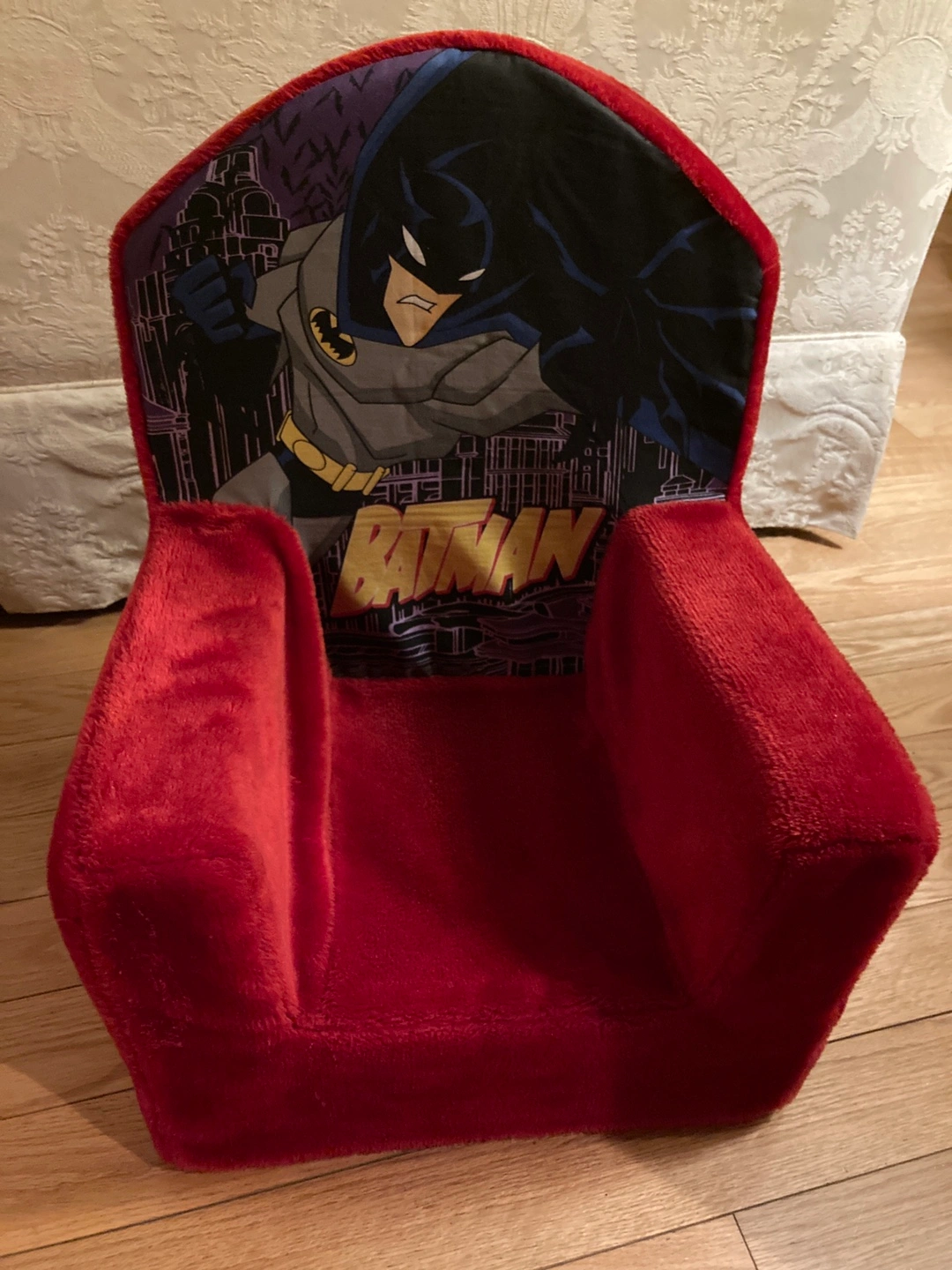 Here's a cute little red plush chair featuring Batman! It's in great condition and perfect for a kid's room or play area. Except clean condition. Has zippered cover for easy washing.