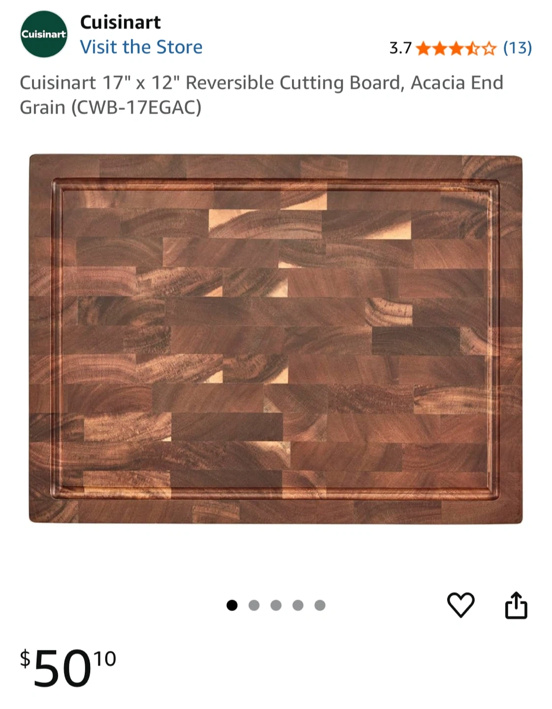 I'm selling a Cuisinart 17" x 12" reversible cutting board. It's made of end grain acacia wood. This cutting board is 17" x 12" x 1.5". Originally bought for $52.99 has knife cuts not to noticeable