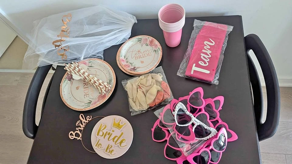 Includes: - 6 pink sashes and 2 sashes for bride (sashes are new/unworn) - 15 pairs of pink glasses and 1 white pair - plates, cups, paper straws - balloons (light & dusty rose colored) - veils, tiaras & badges for the bride - lots of additional crafts (stickers, pens etc) that I will throw in for free
