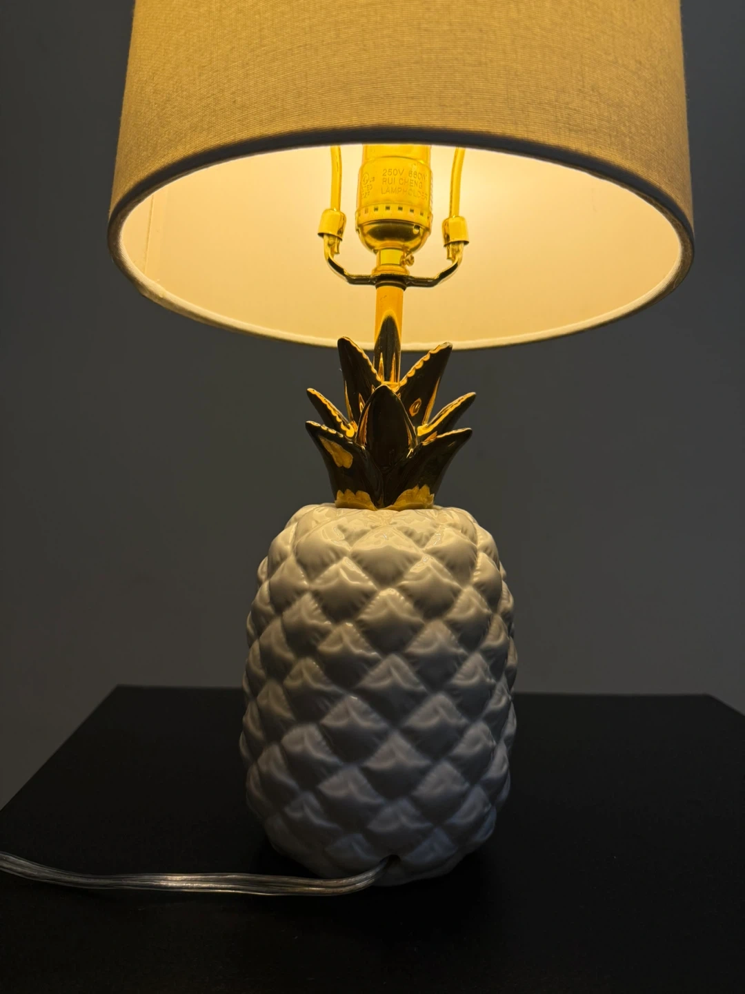 Here's a cute and stylish pineapple table lamp that would look great in any room! The base is shaped like a pineapple and has a white textured finish with gold accents. The lampshade is a neutral colour, providing a warm and inviting glow. - Moving Sale by Sep 1st