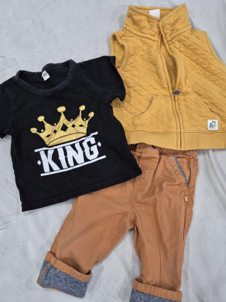 Cute baby outfit set including: - A black t-shirt with a 'King' print - A mustard yellow quilted vest - Brown pants with rolled cuffs All items are in great condition and ready for a new little one!
