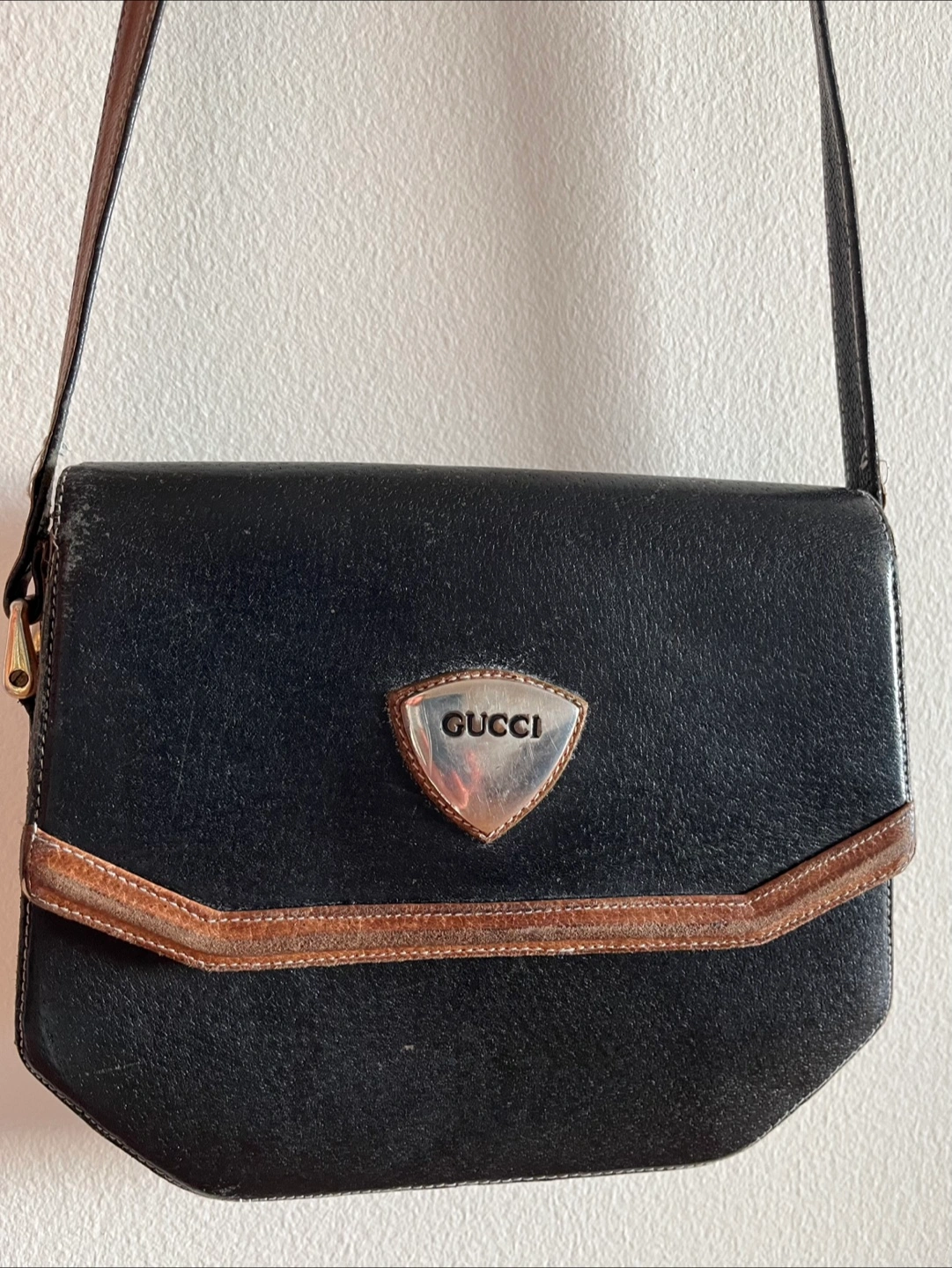Selling a vintage Gucci shoulder bag in black leather. Brown leather trim and the classic Gucci logo. It's a stylish piece with a timeless design. There are some signs of wear on leather and hardware.