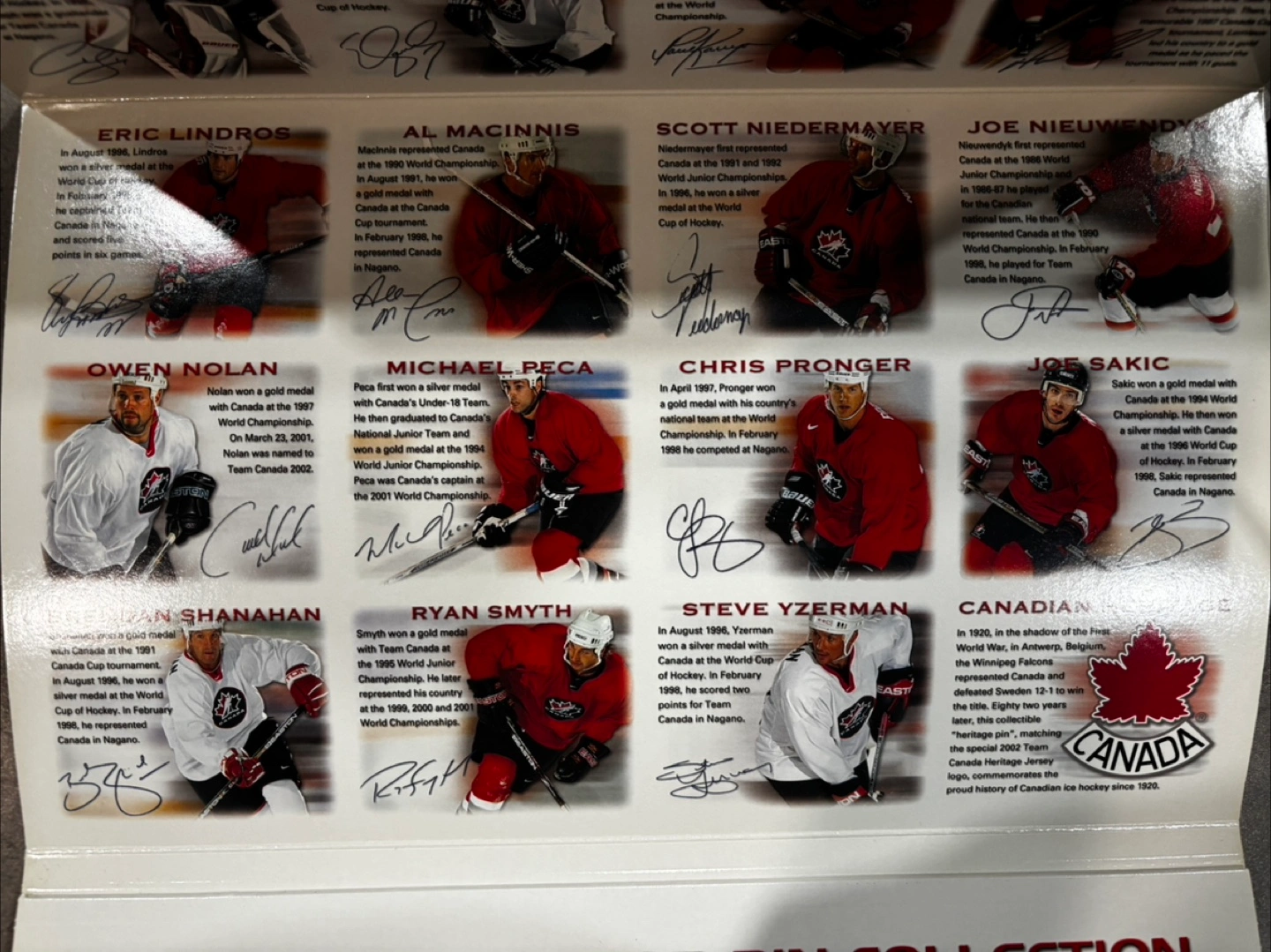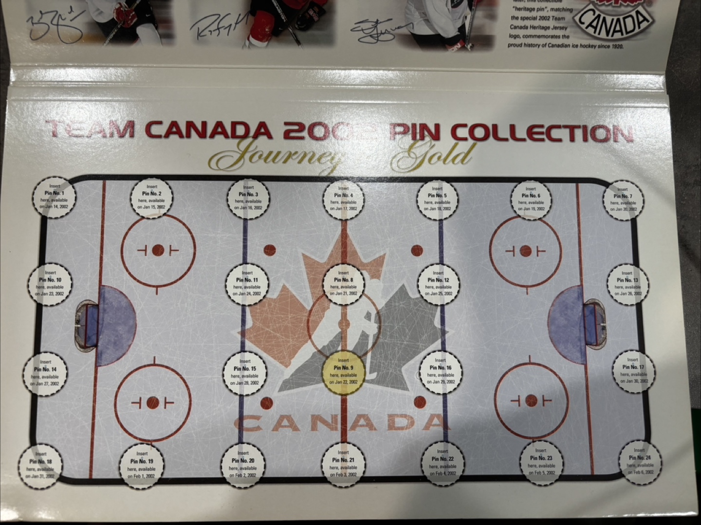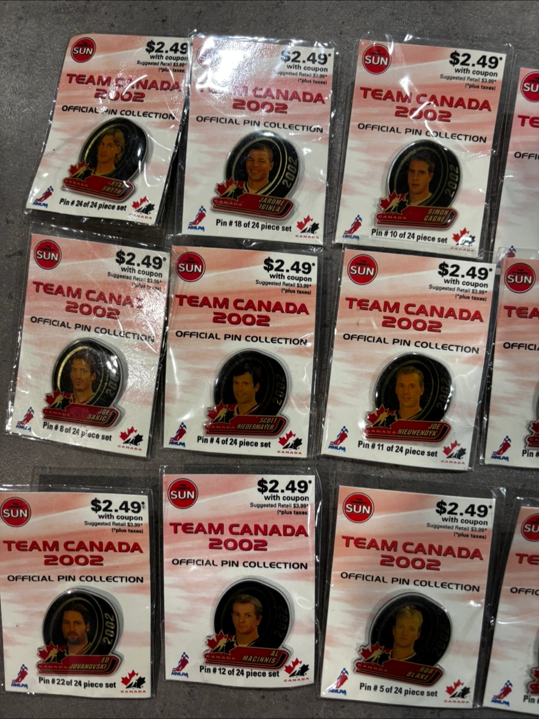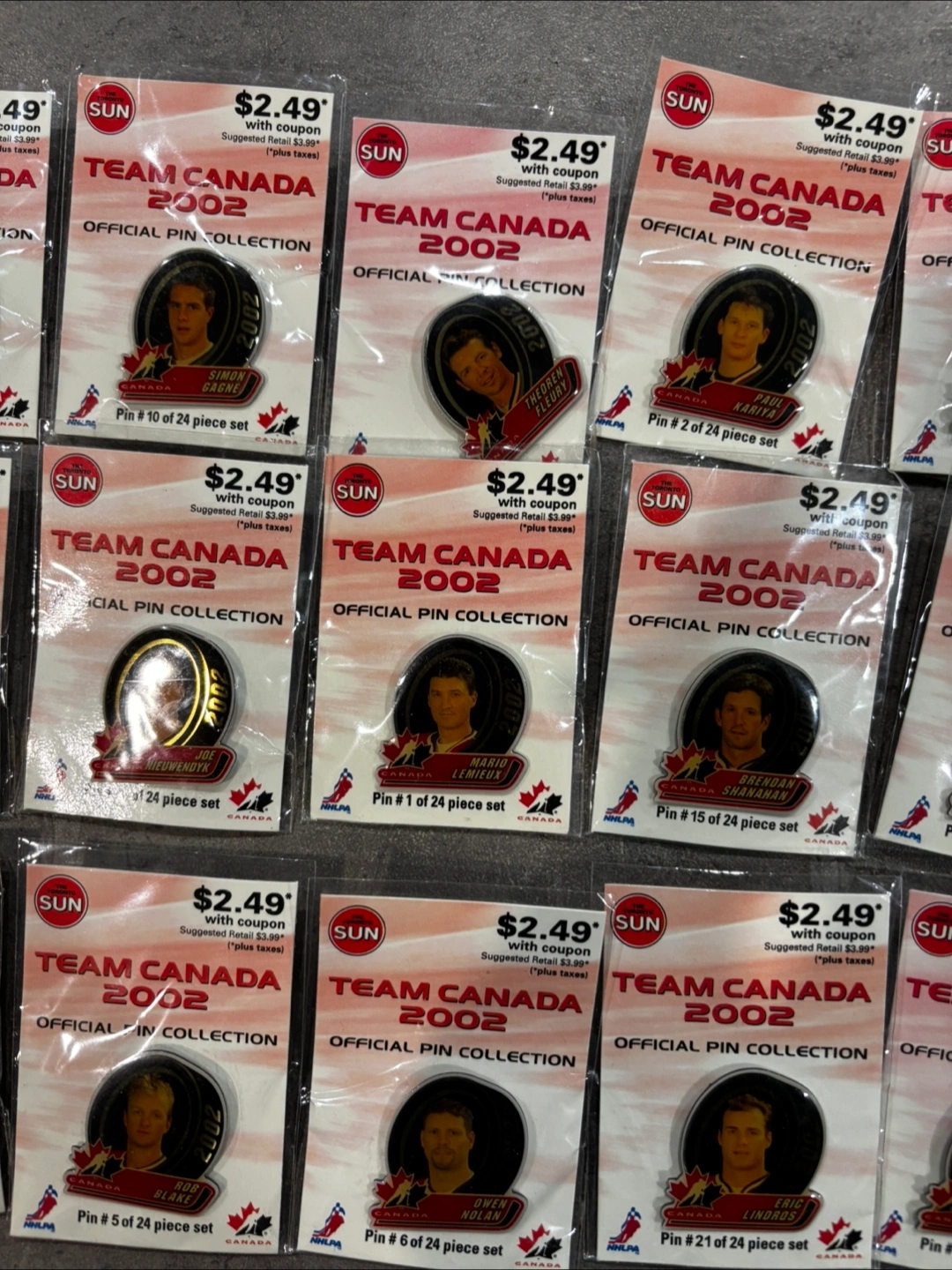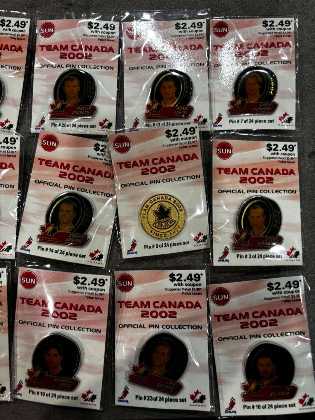 Selling a complete set of Team Canada 2002 Official Pin Collection. Each pin is individually packaged and in great condition. This is a perfect item for any hockey fan or collector!