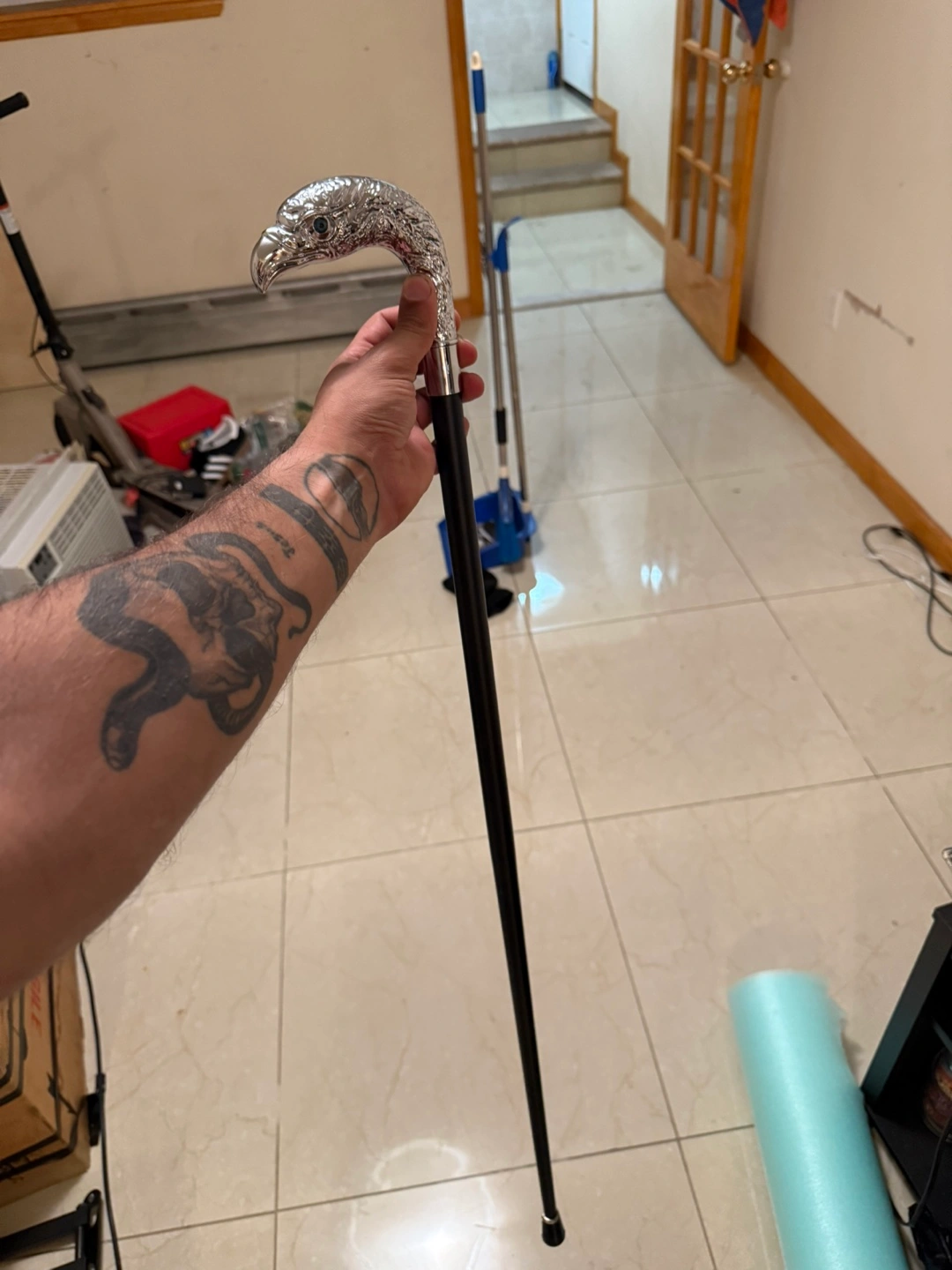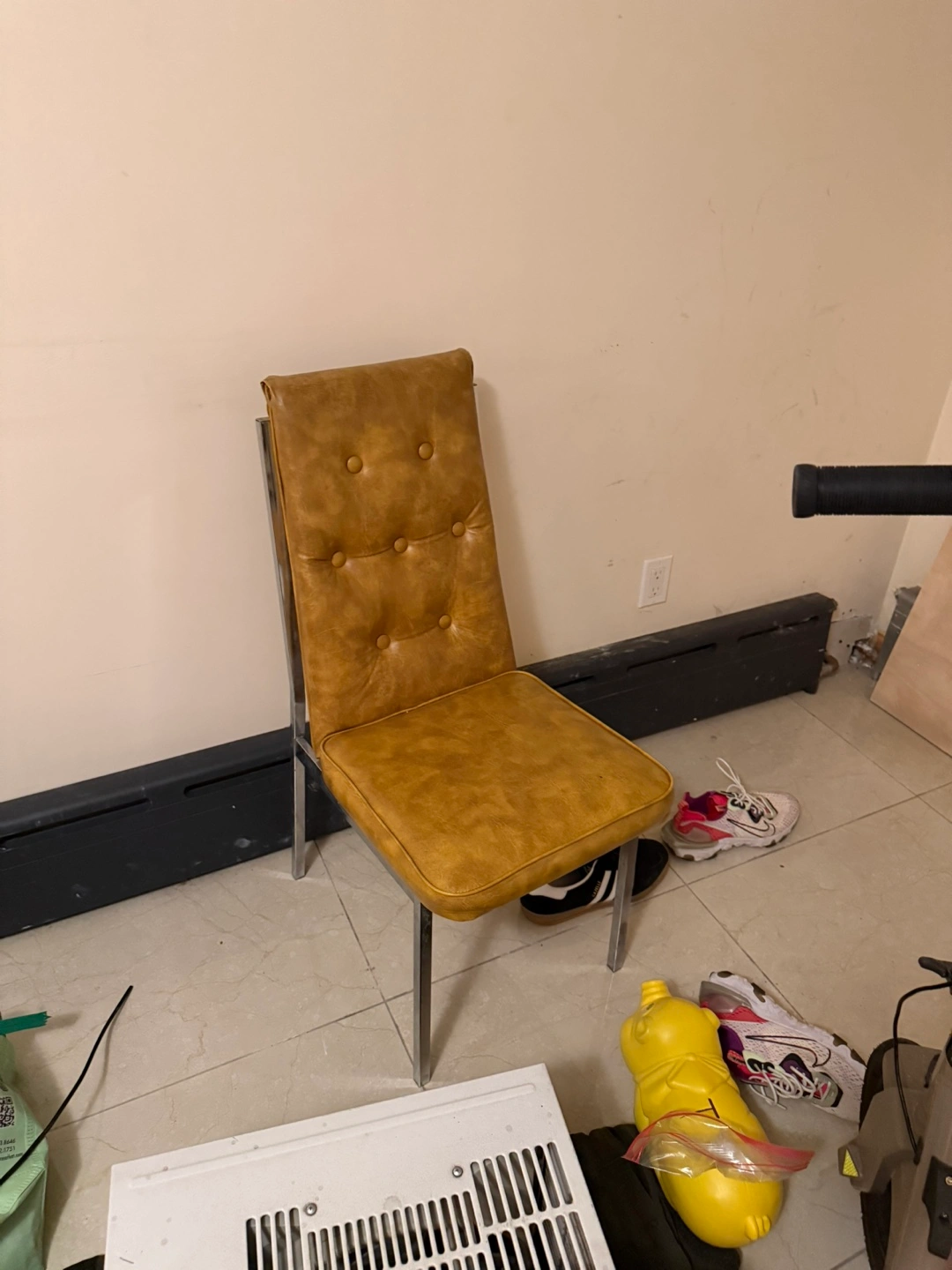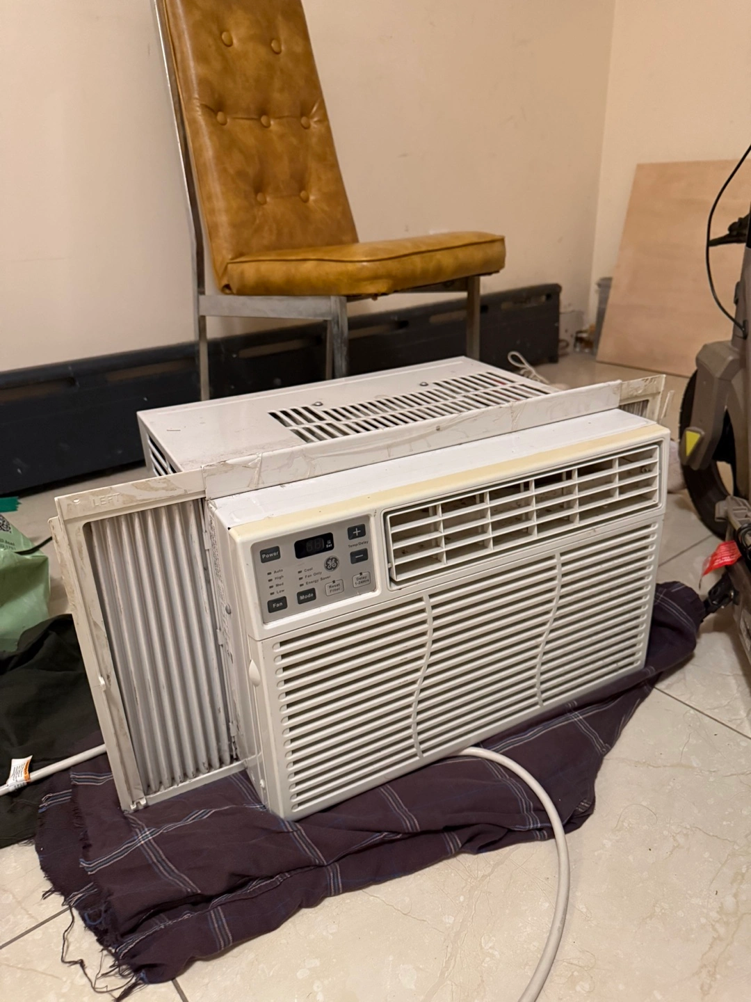 A collection of various items for sale: a GE air conditioner, an Insignia TV, an eagle head walking cane, a black TV stand, and a brown chair