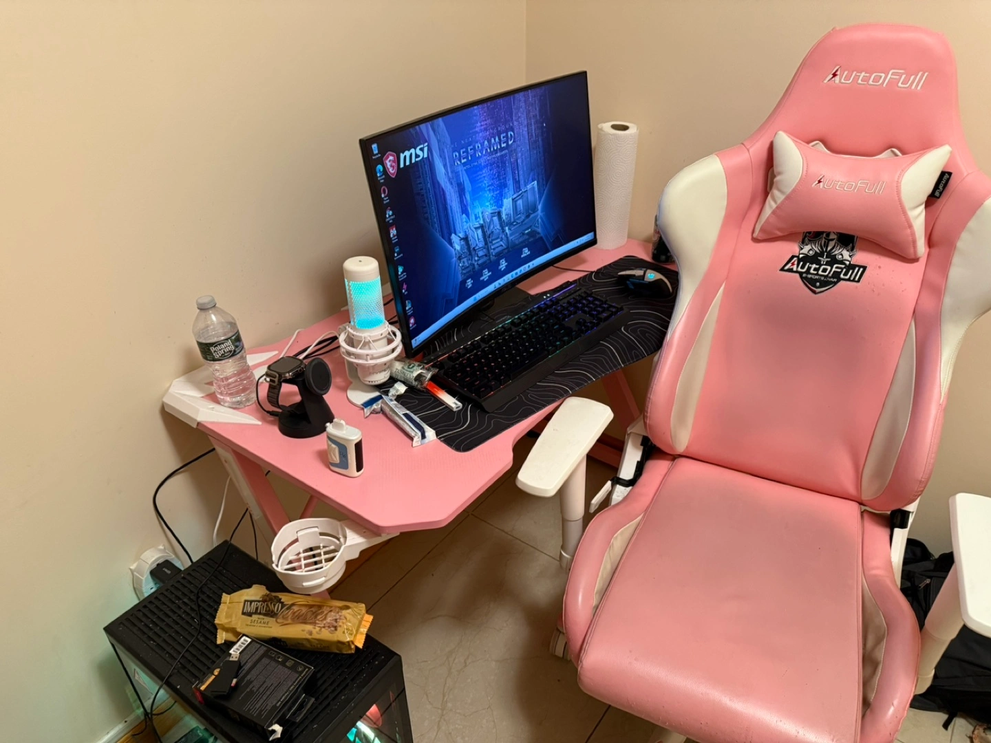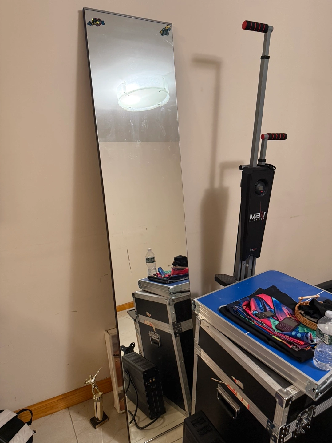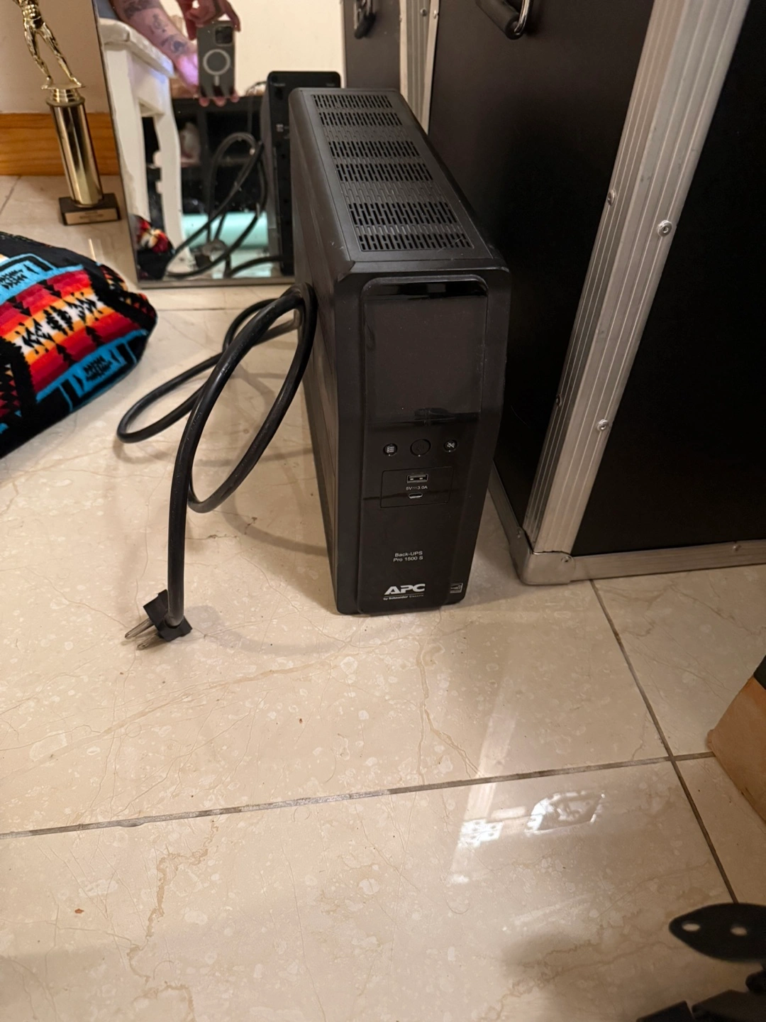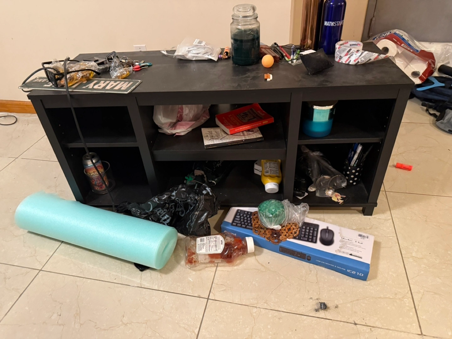 A collection of various items for sale: a GE air conditioner, an Insignia TV, an eagle head walking cane, a black TV stand, and a brown chair