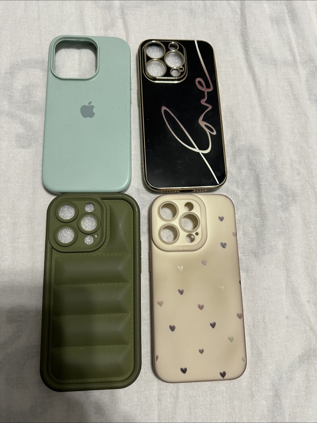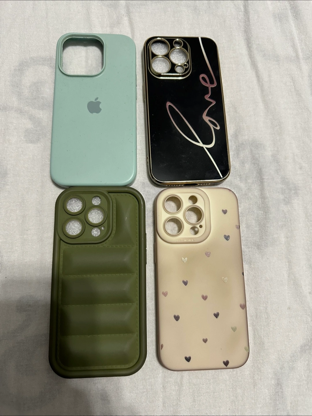 Selling a set of four iPhone cases! There's a variety of styles and colours to choose from, including a light green case with the Apple logo, a black case with a gold 'love' design, an olive green puffy case, and a cream-coloured case with little hearts. They're all in good condition and ready for a new phone.