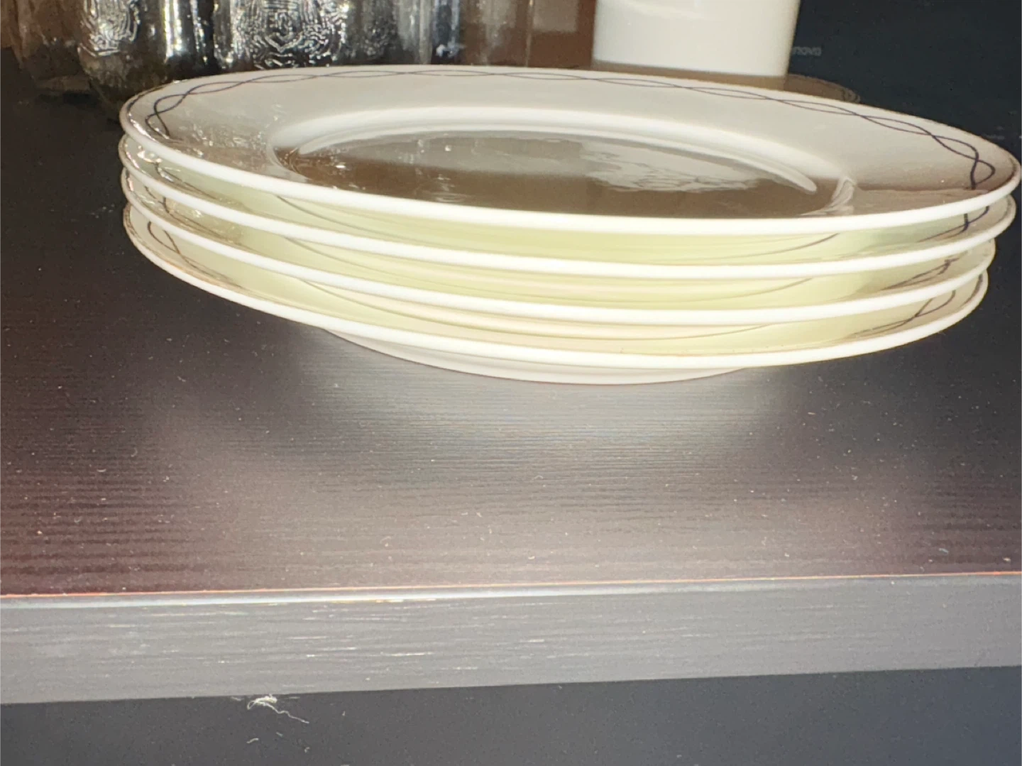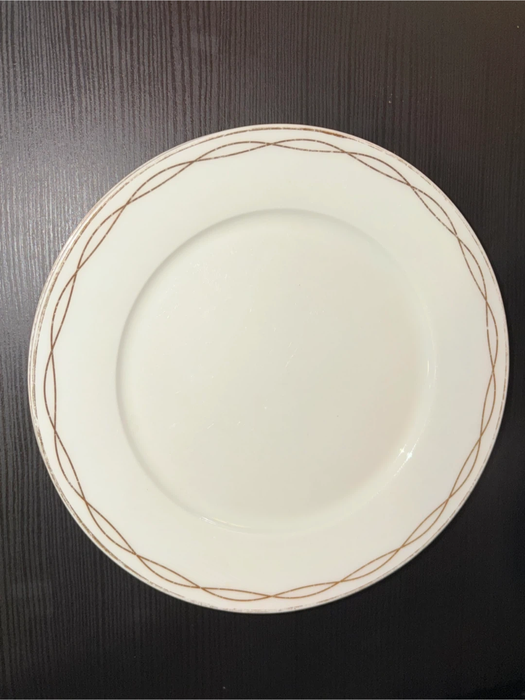 Selling a set of four dinner plates. They are white with a gold-coloured design around the rim. They are in great condition and ready for a new home!