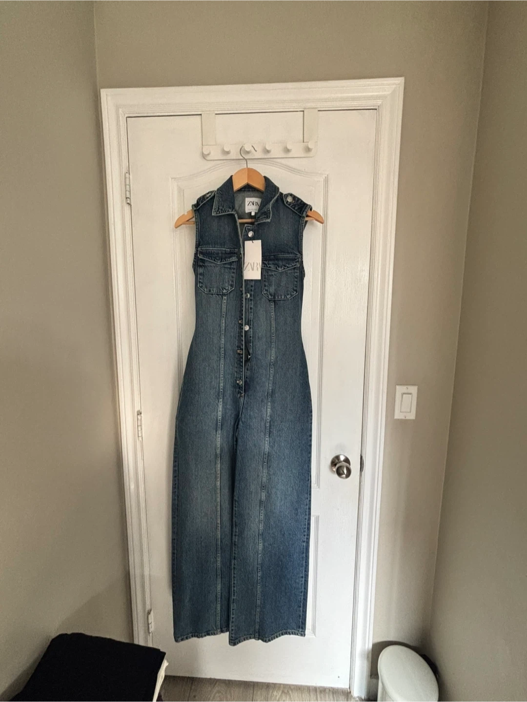 Selling a brand new Zara denim jumpsuit! It's a size small and still has the original tag attached. Originally bought for $99, this jumpsuit is in perfect condition and ready for a new home