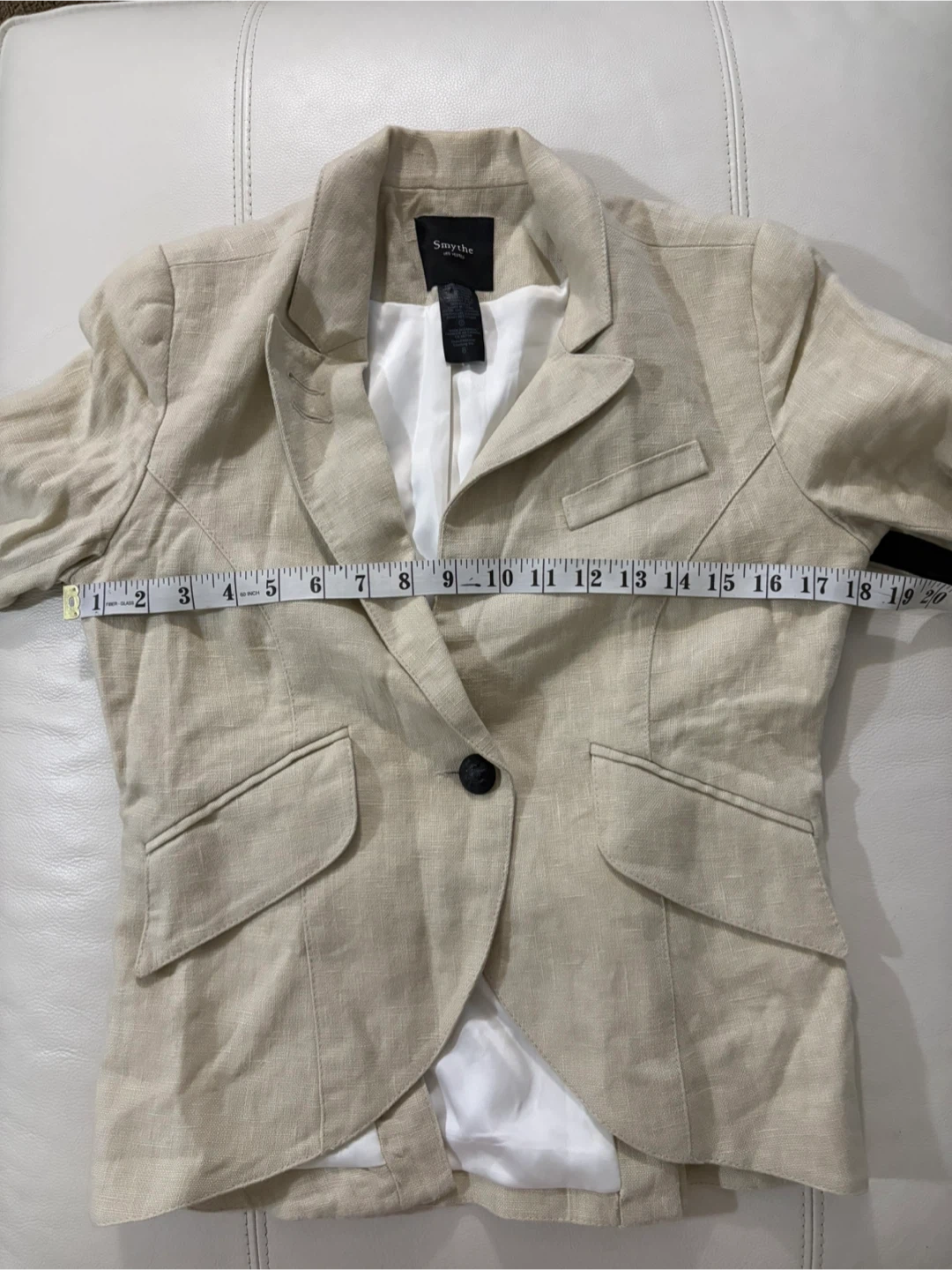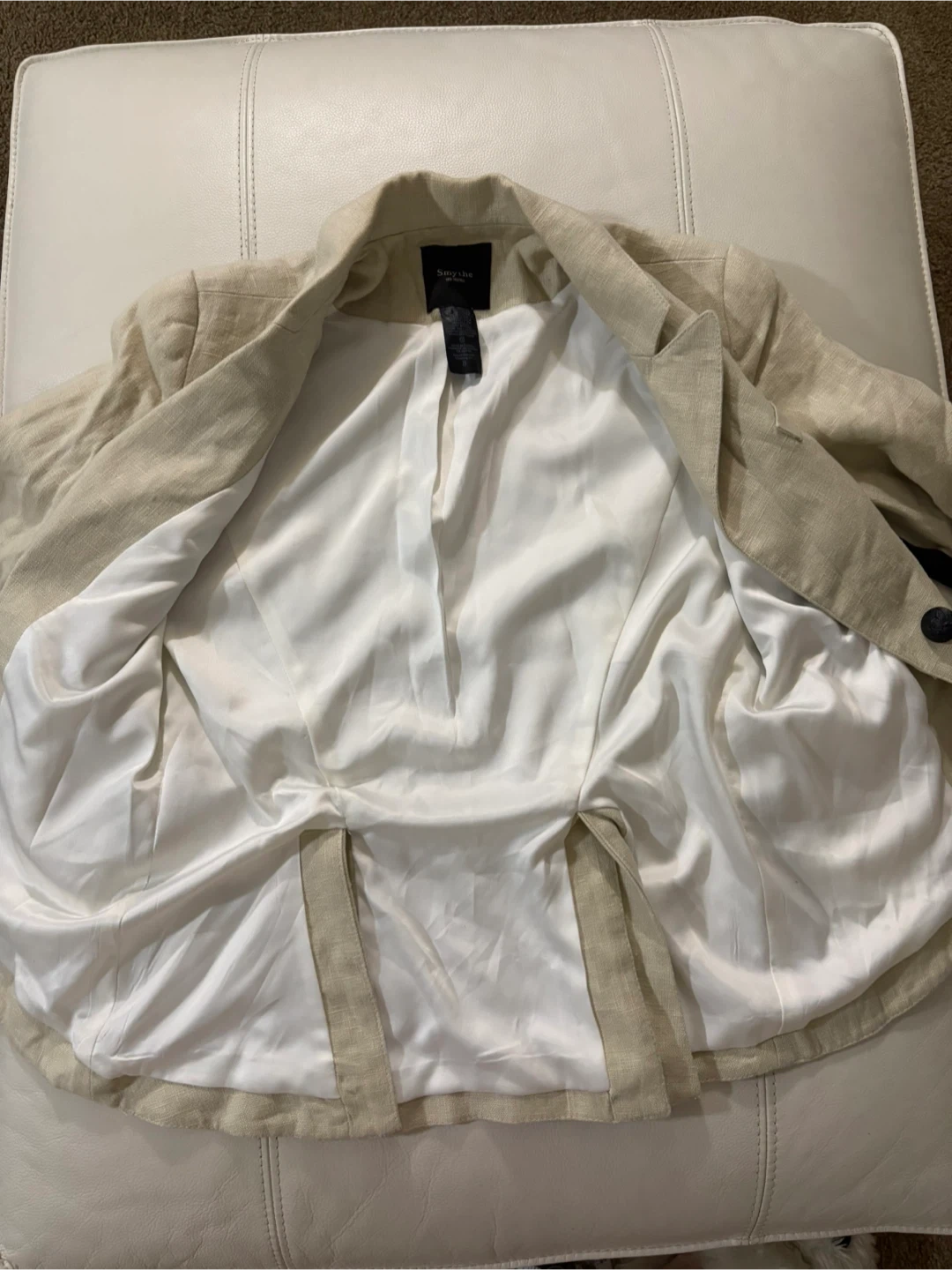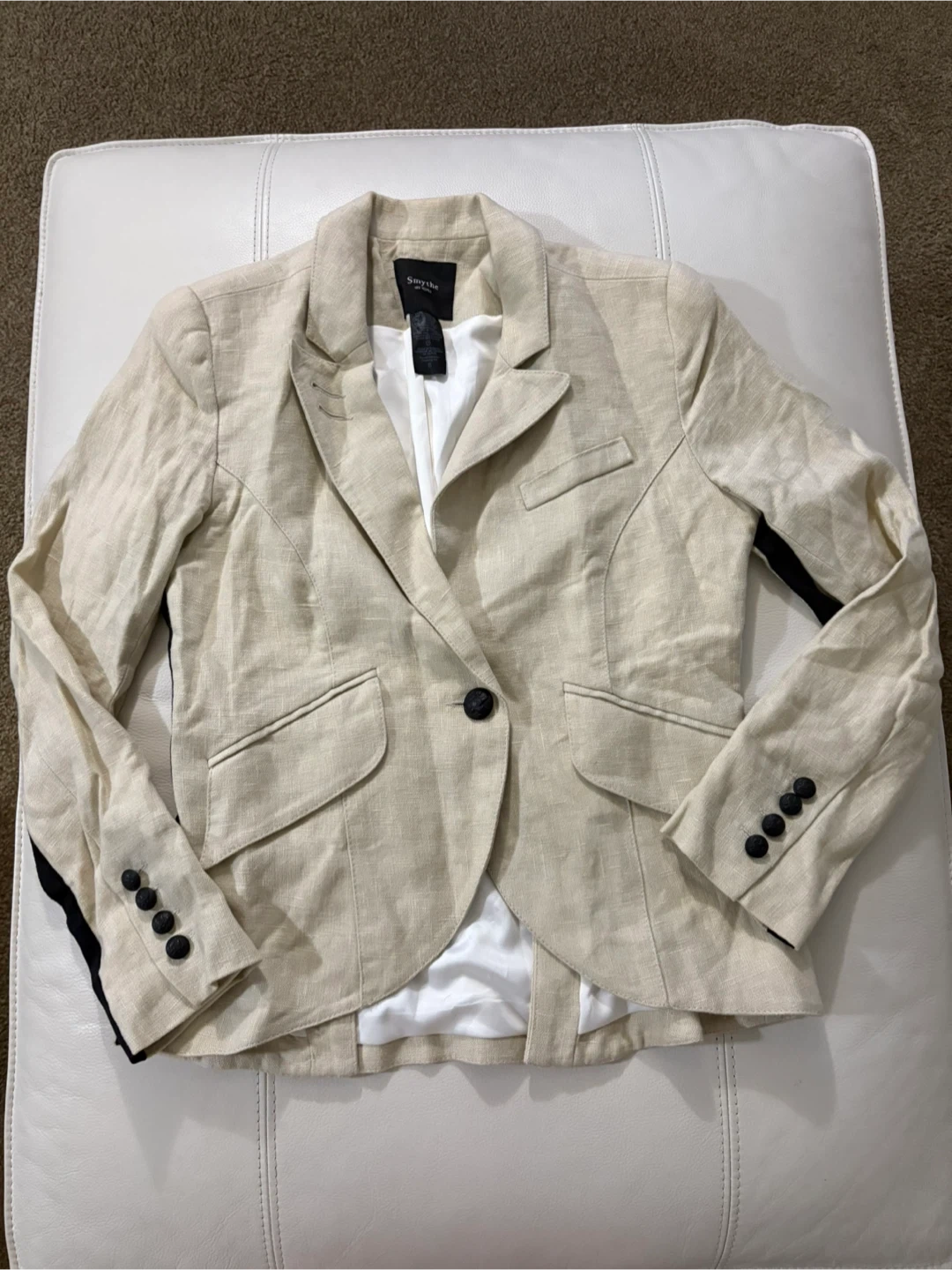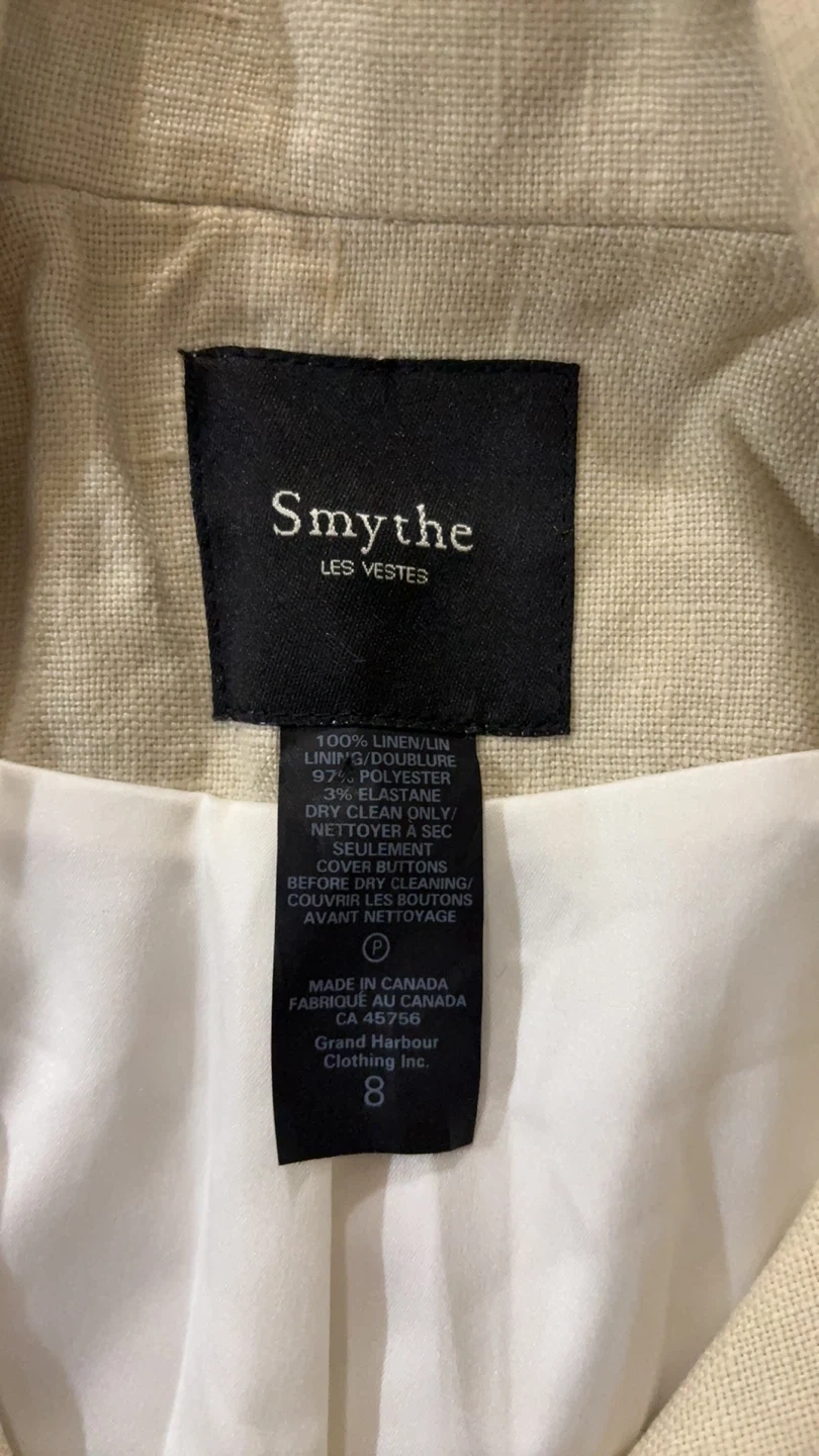 Selling a Smythe blazer in size 8. It's a beige colour, made of 100% linen with a 92% polyester lining. Perfect for spring!