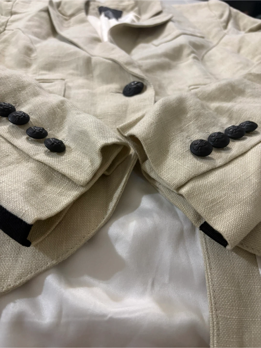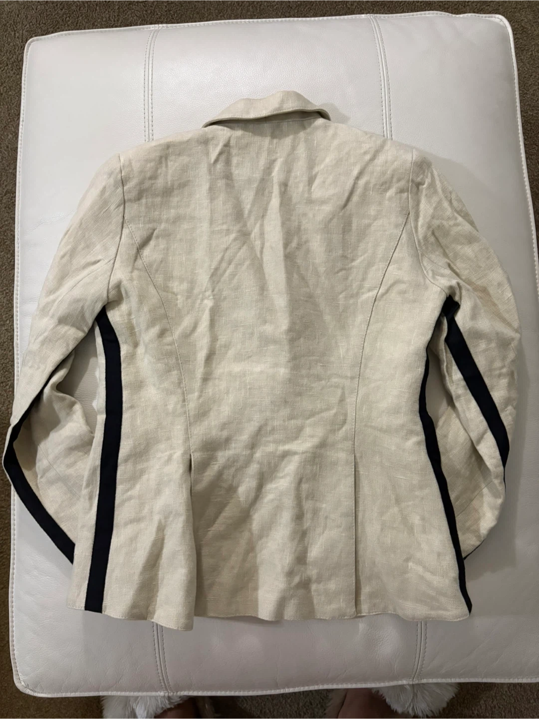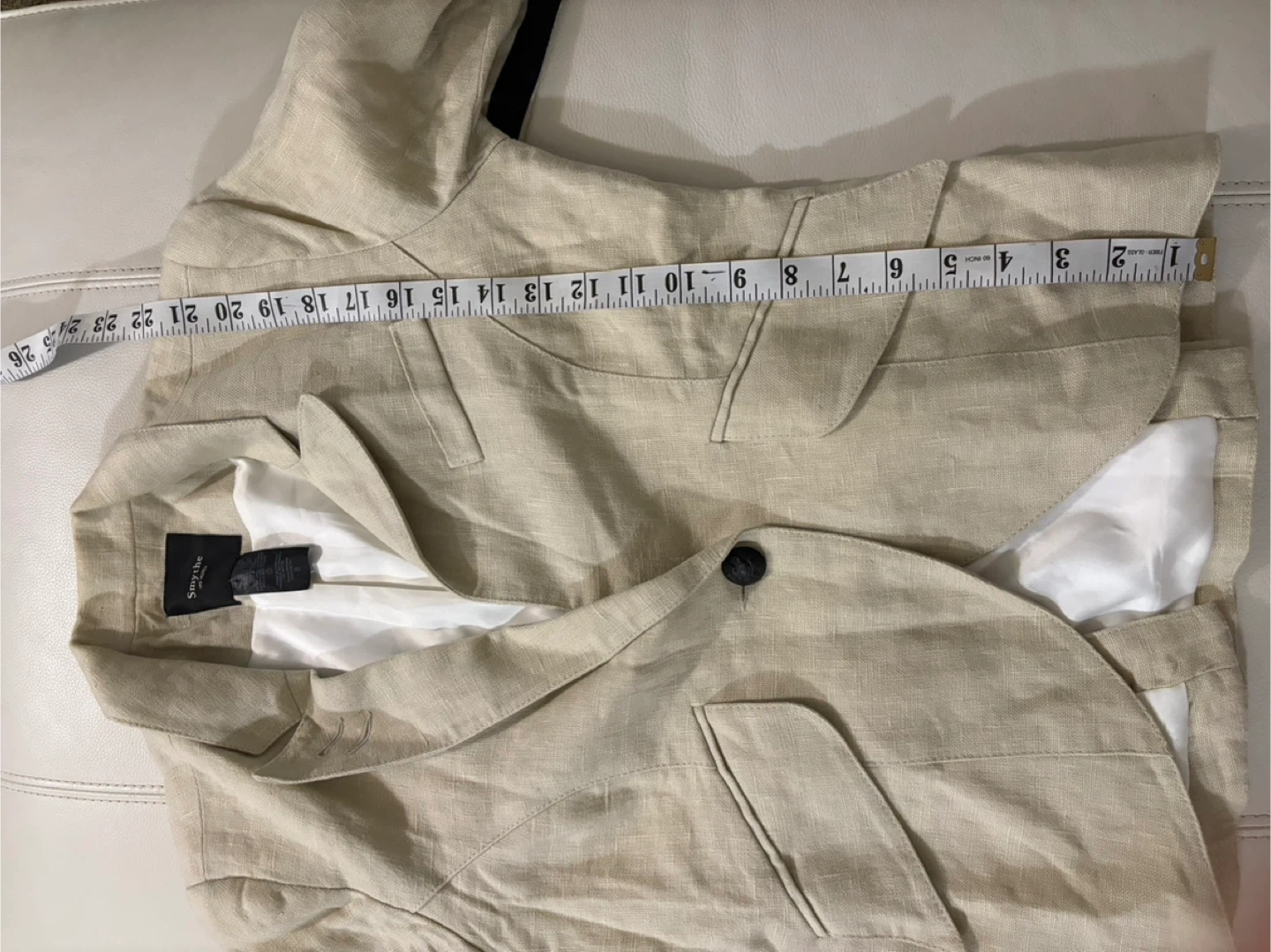 Selling a Smythe blazer in size 8. It's a beige colour, made of 100% linen with a 92% polyester lining. Perfect for spring!