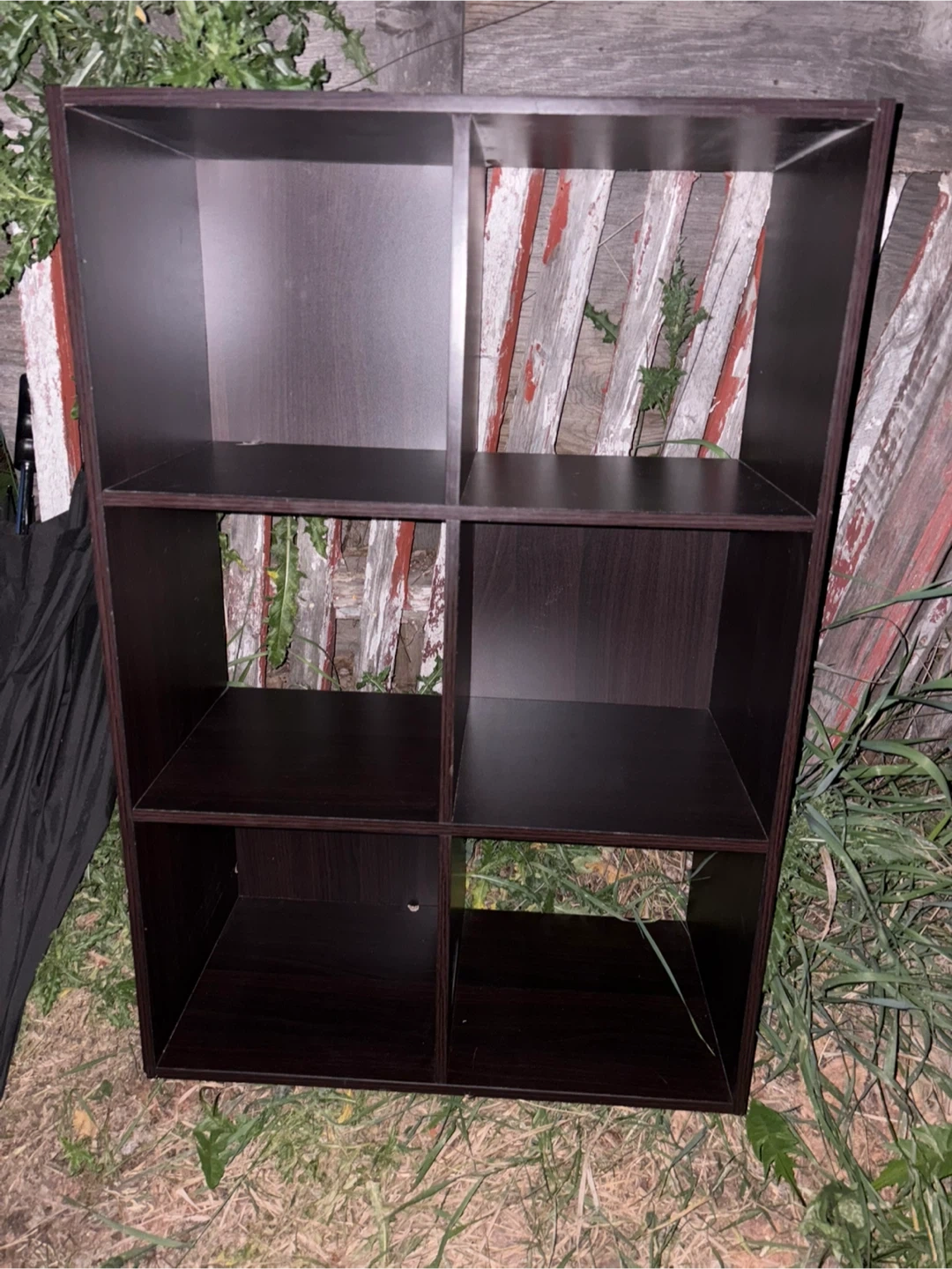 Here's a brown 6-cube storage shelf, perfect for organizing your space ! It's great for books, decor, or anything you want to keep tidy. It's in good condition and ready for a new home
