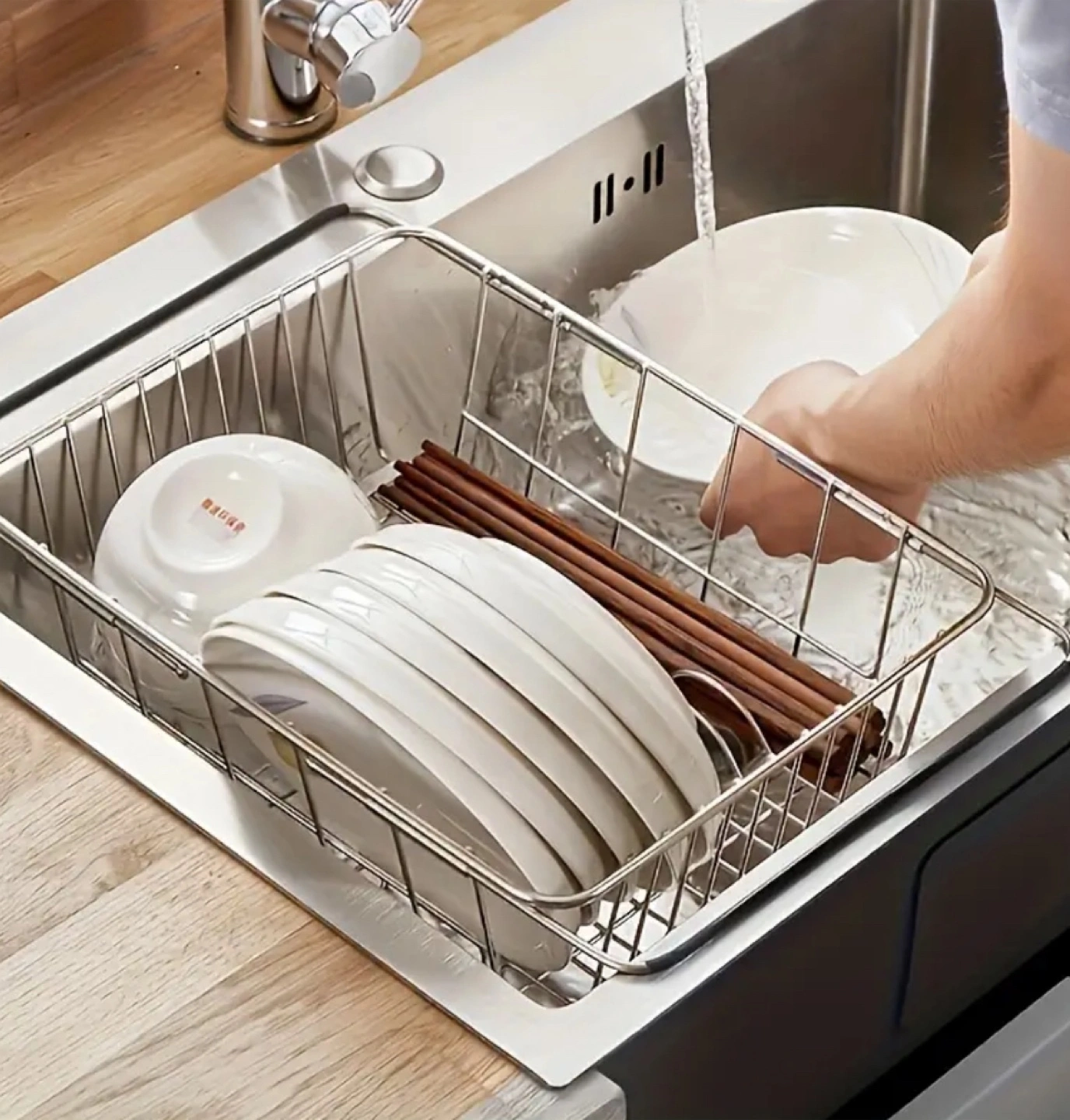 I'm selling a dish rack for your kitchen sink! It's designed to sit right inside your sink to drain dishes and chopsticks. It helps with storage and has a retractable design. The dimensions are approximately 45.5cm x 34cm x 25cm.