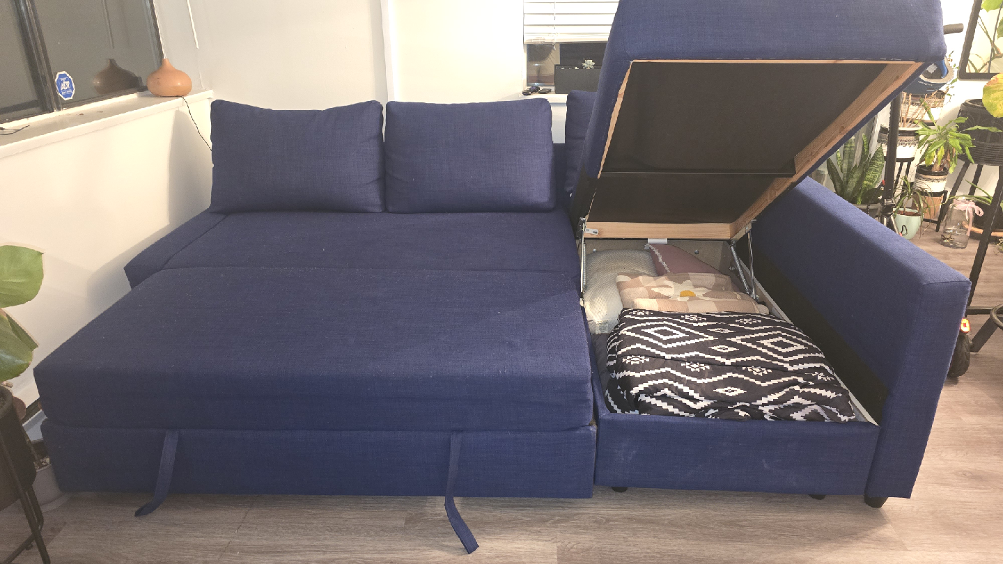 Selling a comfy blue sofa bed! It's in great shape and has a handy storage compartment underneath for blankets or pillows. Perfect for small spaces or guest rooms!