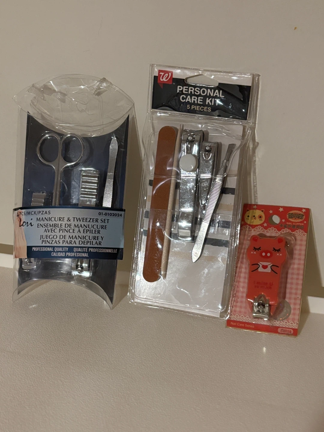 I'm selling a new manicure and tweezer set from Loni, along with a 5-piece personal care kit from Walgreens. Also included is a cute nail clipper!