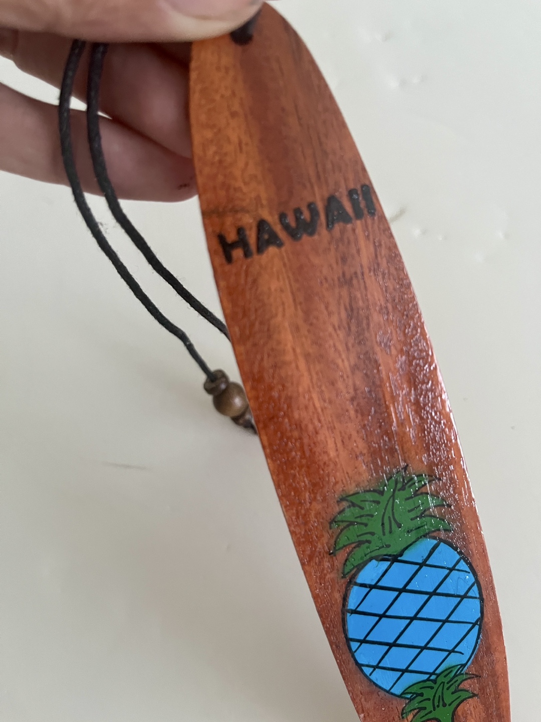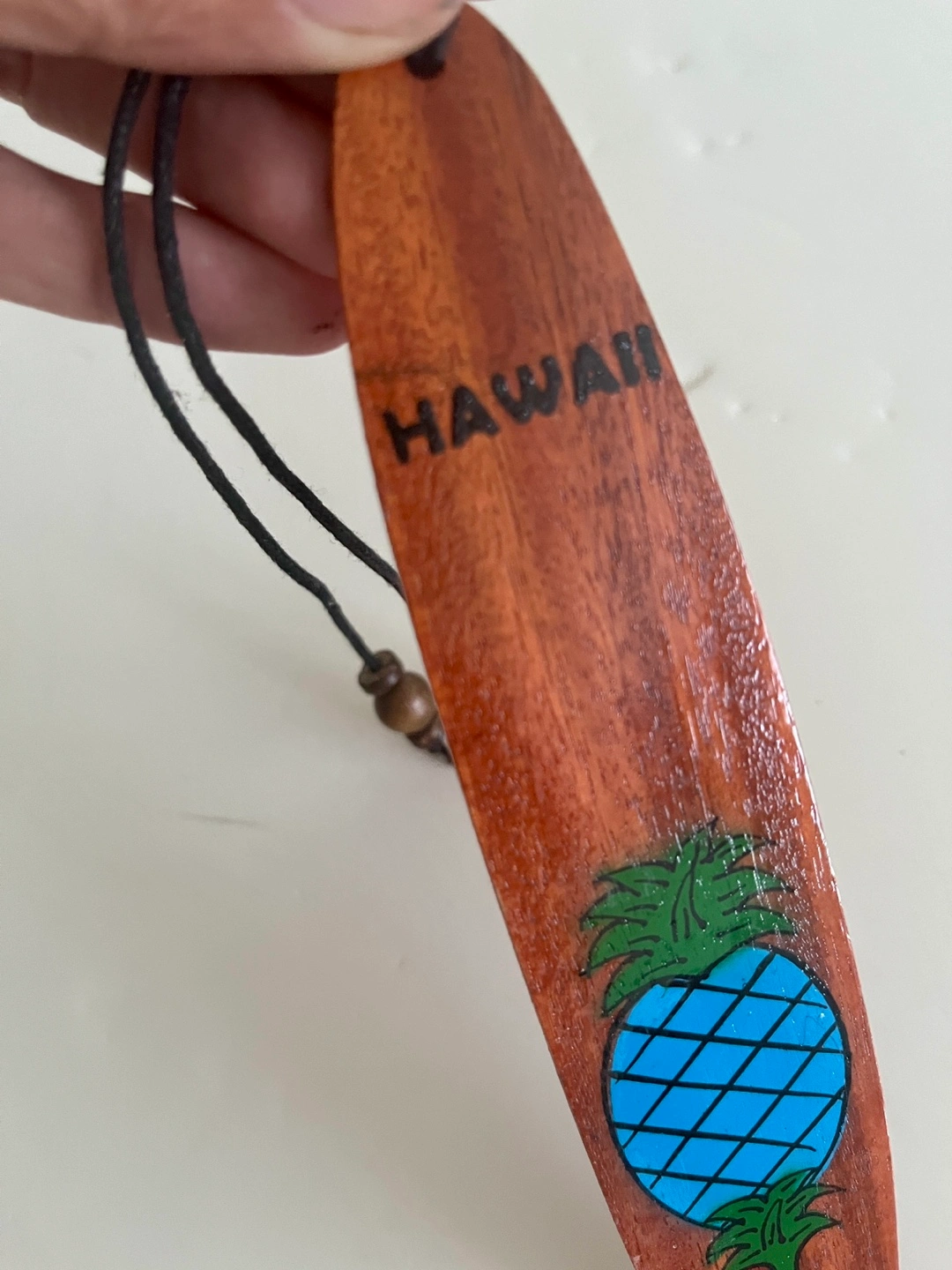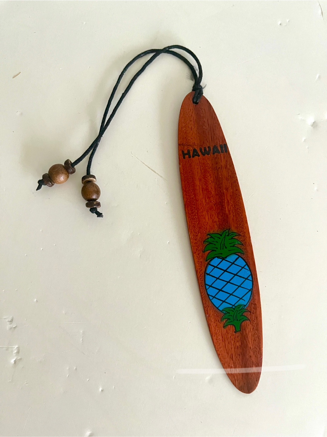 This is a cute wooden surfboard bookmark (or ornament) from Hawaii. It has a pineapple design and a string for hanging. Perfect for adding a touch of tropical flair to your home or as a souvenir!