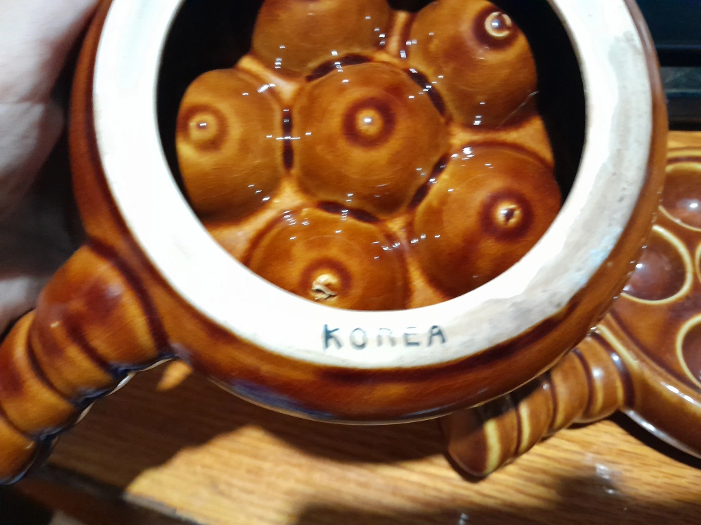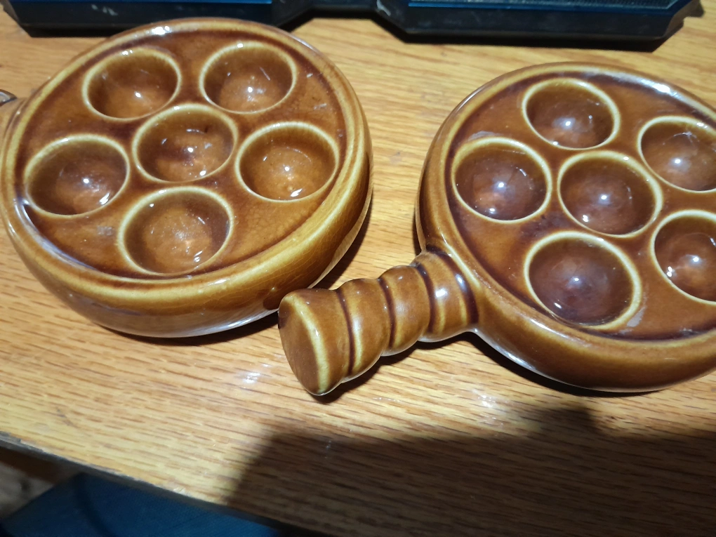 Selling a set of vintage escargot plates, made in Korea. These unique brown ceramic dishes are perfect for serving escargots or other appetizers. They feature a classic design with individual wells and a handle for easy serving!