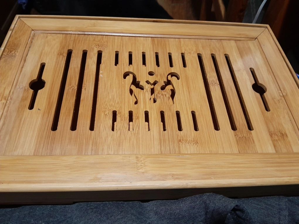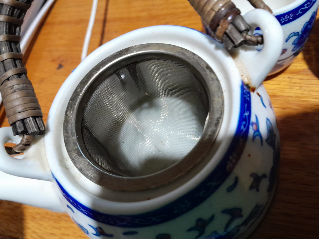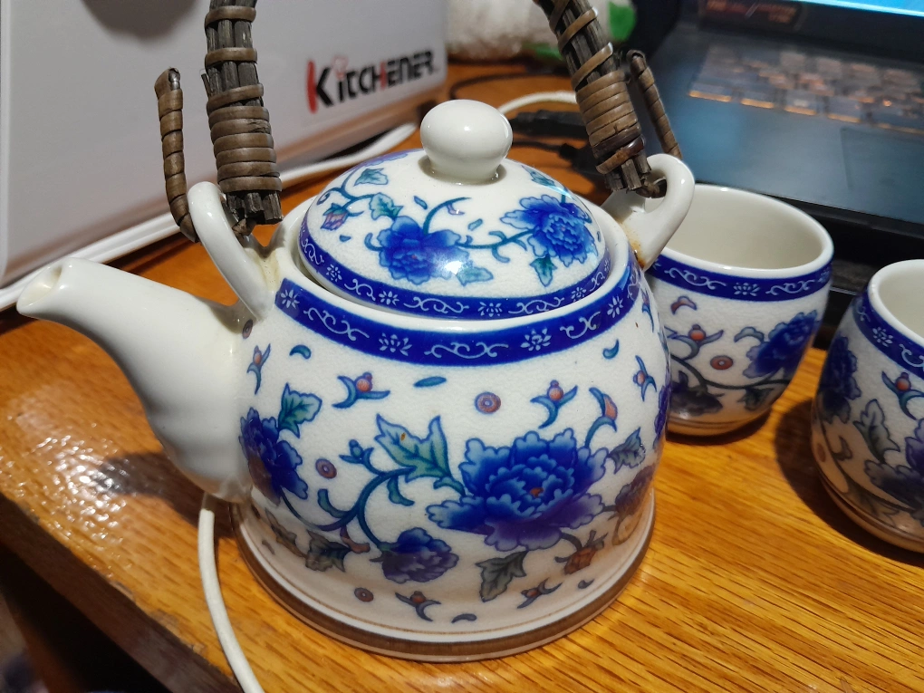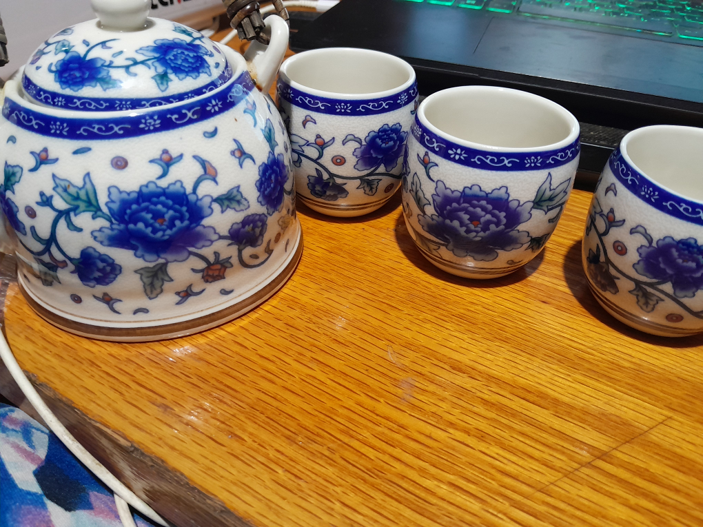 Selling a tea set that comes with a bamboo tray. The set includes a teapot and four cups, all decorated with a beautiful blue floral pattern. The teapot has a built-in filter, perfect for loose leaf tea. The bamboo tray is great for serving and adds a touch of elegance to your tea time