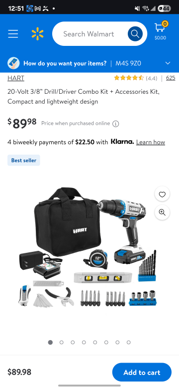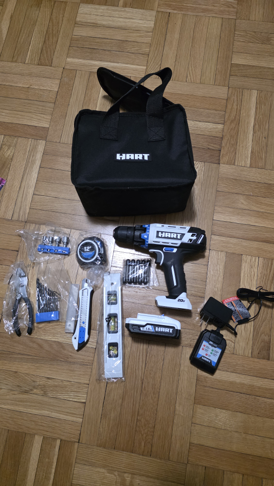Selling a Hart 20-Volt 3/8" Drill/Driver Combo Kit. It comes with accessories, is compact, and has a lightweight design. It includes the bag, drill, battery, charger, and various accessories as pictured. Originally bought for $89.98. Used only once to assemble a bedframe.