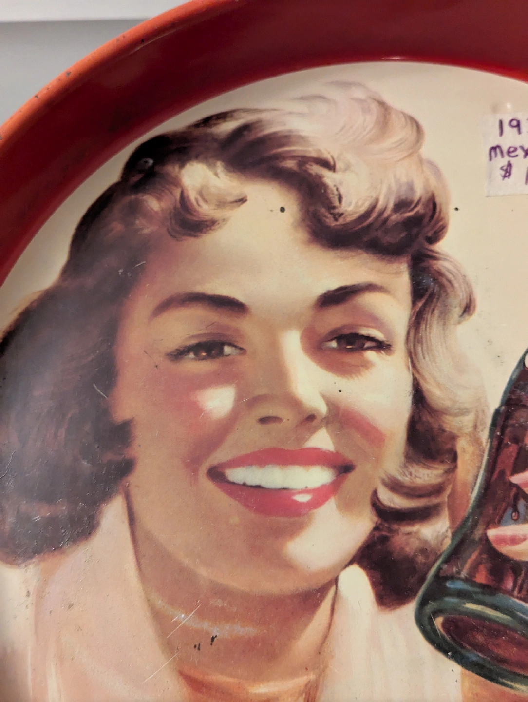 Selling a 1928 vintage Coca Cola serving tray with a classic design. It features a woman holding a bottle of Coca-Cola. The tray has a red rim and shows some signs of wear consistent with its age, adding to its vintage charm.