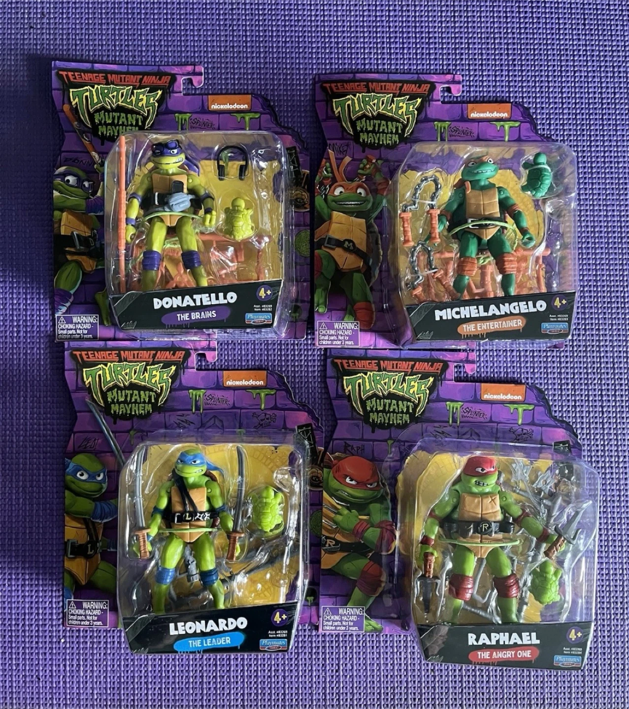 I'm selling a set of Teenage Mutant Ninja Turtles Mutant Mayhem action figures! Each turtle is individually packaged and ready for a new home. These figures are from Playmates and are suitable for ages 4+. They include Donatello, Michelangelo, Leonardo, and Raphael!