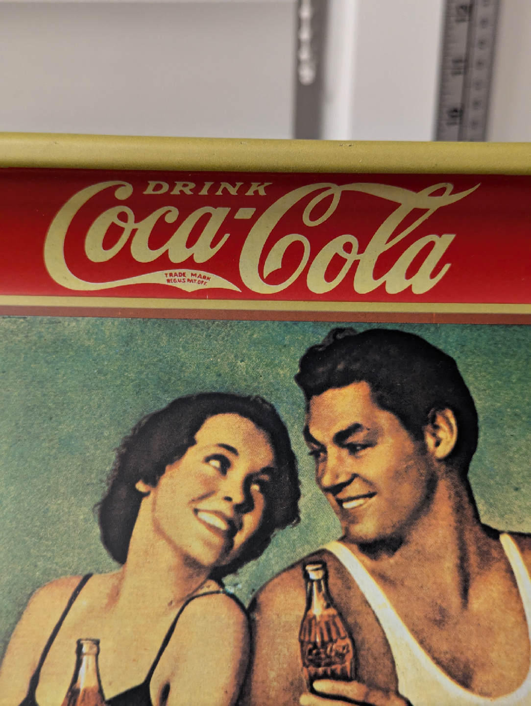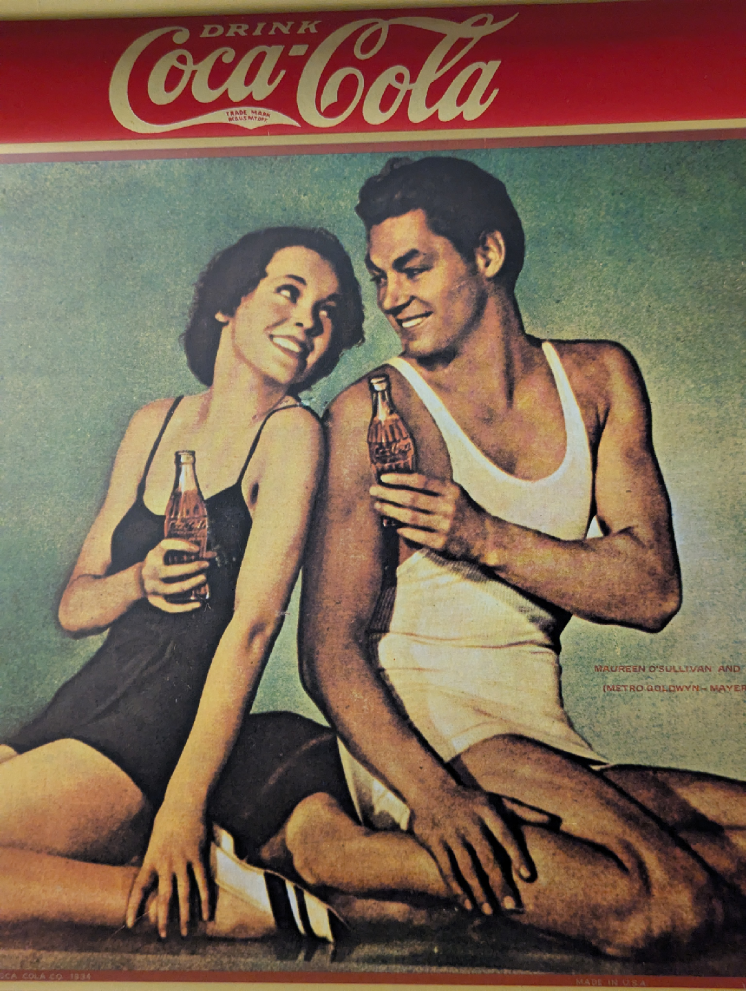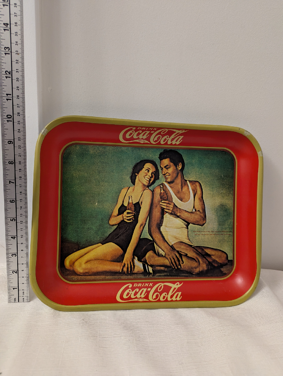 1970s Reproduction 1934 Coke Coca Cola Serving Tray - The original Tarzan Johnny Weismuller and Maureen O'Sullivan. This tray is a 1970s reproduction of a tray that dates back to 1934 and has a red and gold rim. This was the first tray I bought in the 1980s at the Stouffville flea market.