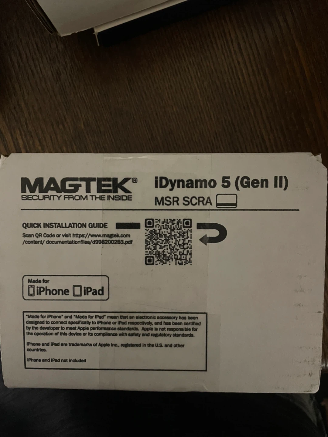 Selling a Magtek iDynamo 5 (Gen II) MSR SCRA. It's made for iPhone and iPad and comes with the quick installation guide. Box is included