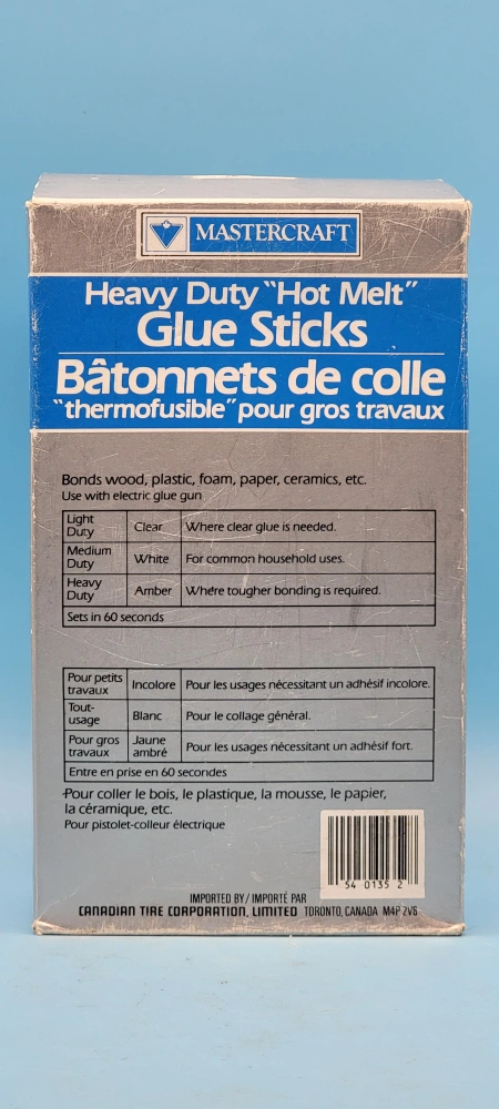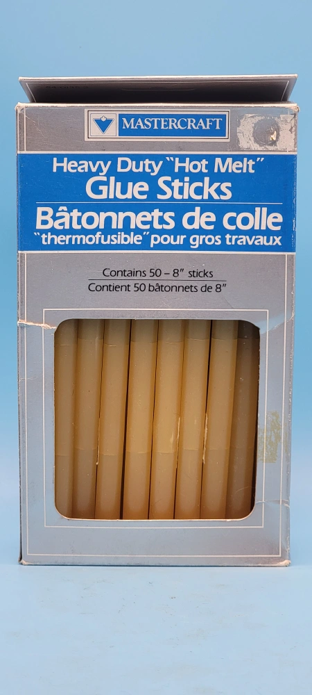 Selling a box of Mastercraft Heavy Duty Hot Melt Glue Sticks. The box contains 48 of 50 sticks that are 8 inches long. They're great for bonding wood, plastic, foam, paper, and ceramics with an electric glue gun. Perfect for both small and large projects