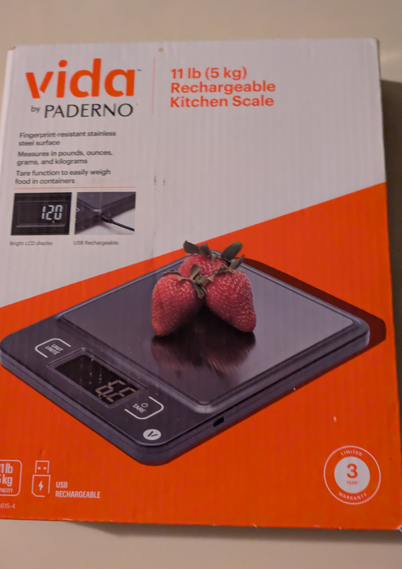 Selling a Vida by Paderno 11 lb (5 kg) rechargeable kitchen scale. It features: