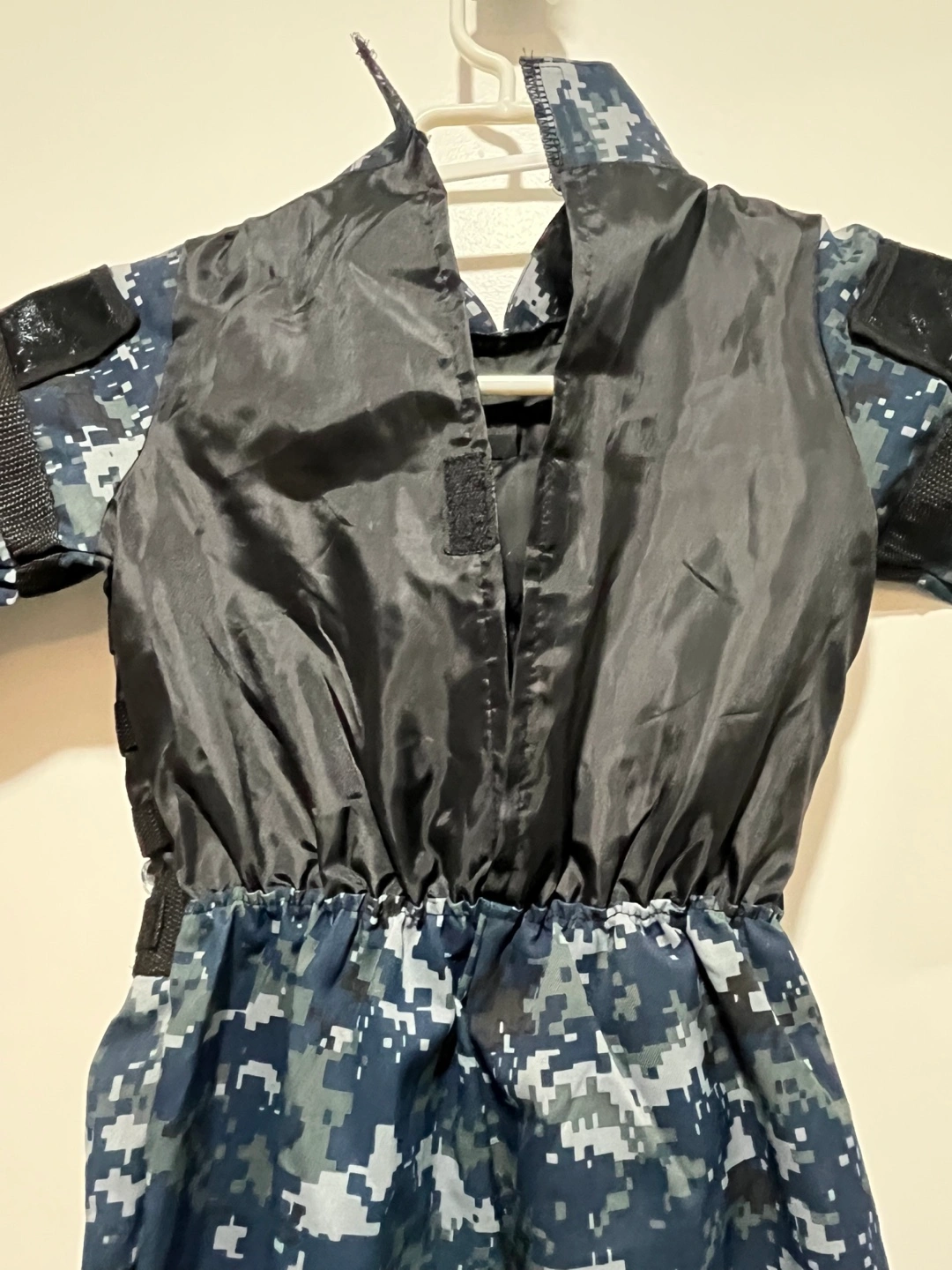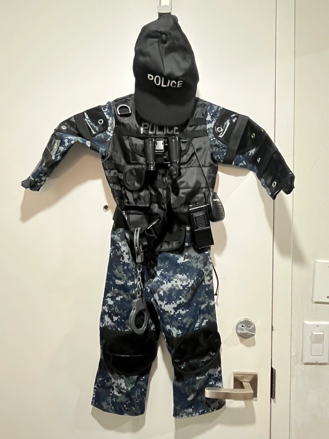 Here's a complete police officer costume! It comes with a cap, vest, handcuffs, and a walkie-talkie. Perfect for dress-up or Halloween!