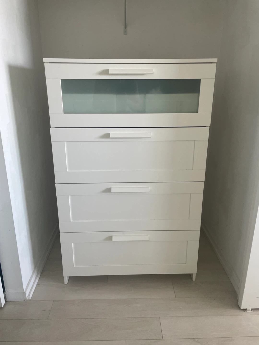 Selling a white IKEA Hemnes chest of drawers. It's in great shape and has a glass-fronted drawer at the top and three regular drawers below. Perfect for adding some extra storage to any room.