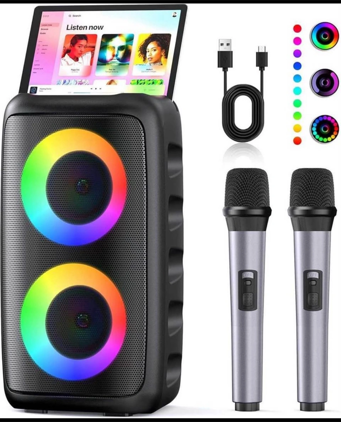Looking to sell this portable karaoke speaker! It comes with dual microphones for some fun singalongs with friends and family. The speaker has cool LED lights that change colour, adding to the karaoke vibe.