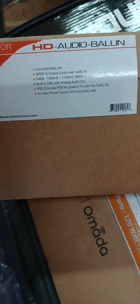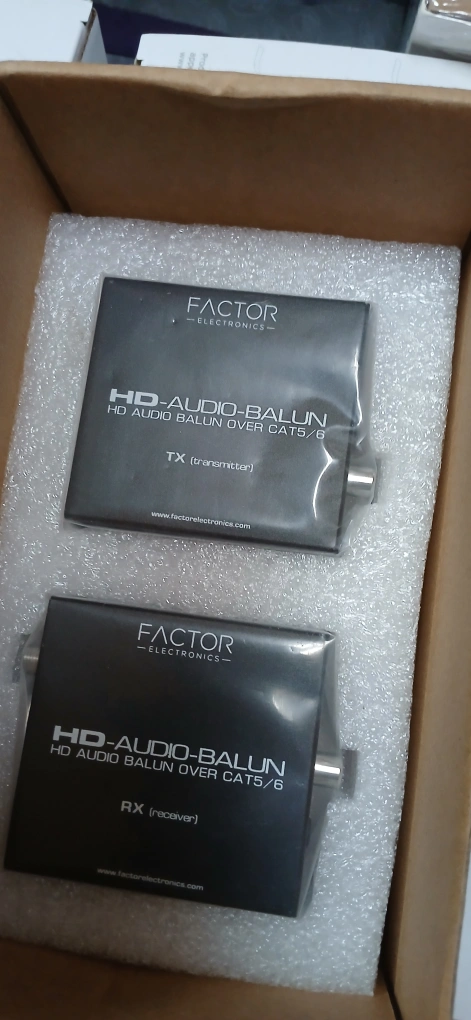 Selling a Factor Electronics HD-Audio-Balun Over CAT5/6. This includes both the transmitter (TX) and receiver (RX). It supports SPDIF & Coaxial Audio over CAT5/6 and 24Bit - 192Khz - (100m) 96Khz. Also features a built-in DAC with Analog Audio Out. The unit is powered via POE (One way POE Rx powers Tx over the Cat5/6). Power supply and mounting rails are included. Box is included