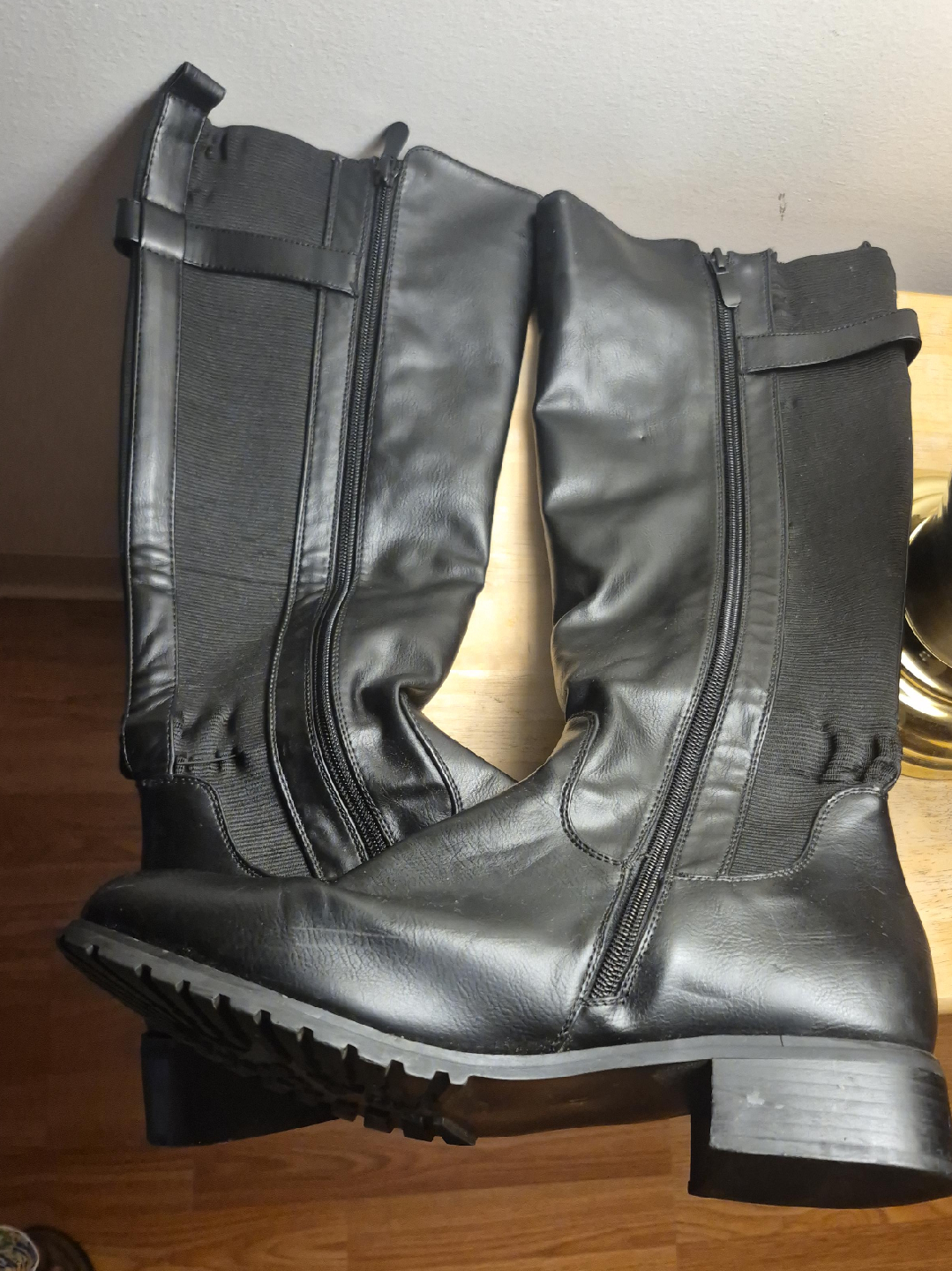These stylish black knee-high boots are in great condition and ready for a new home! They feature a full-length zipper for easy on and off, and a comfortable fit. Perfect for adding a touch of chic to any outfit!
