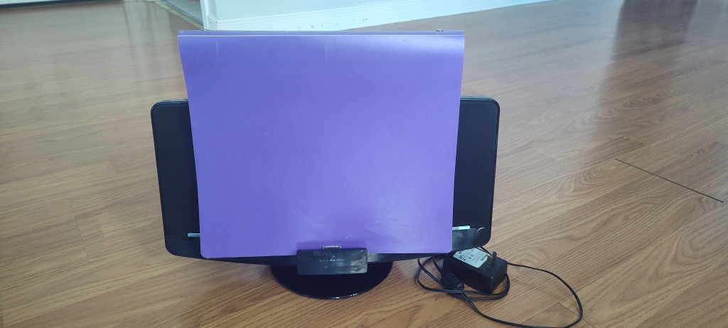 The purple binder is there to demonstrate the size of the sound system. It's very compact.