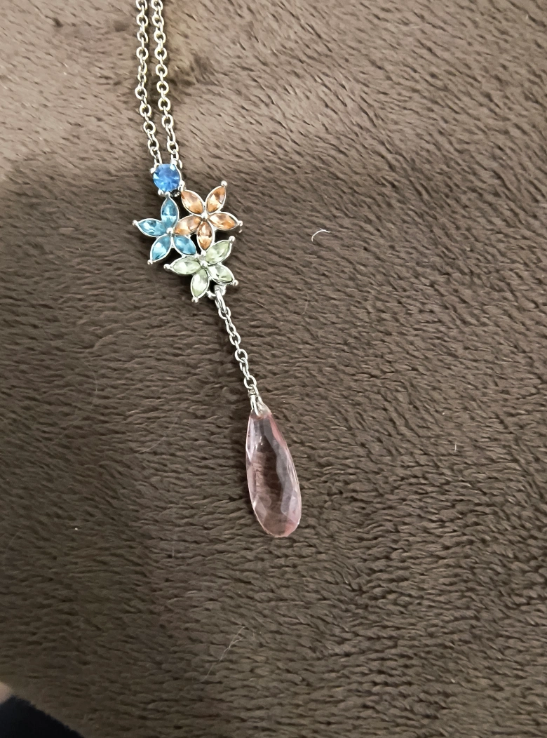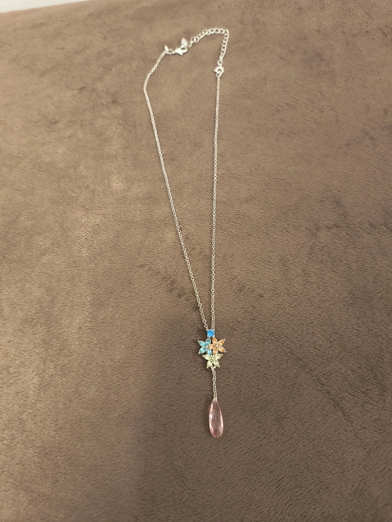 A lovely silver-tone necklace featuring a delicate floral pendant with pastel-coloured petals and a teardrop accent. It's in great condition and ready to add a touch of charm to any outfit