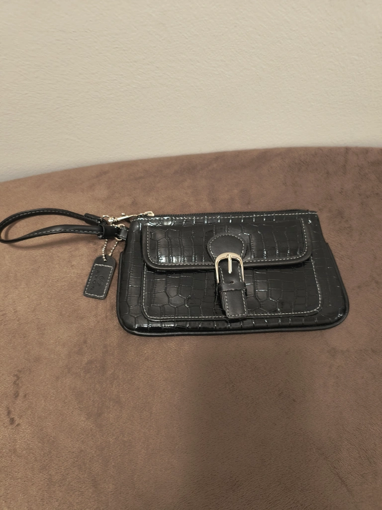 Selling a wristlet in black. It's in great condition and perfect for carrying your essentials! Features a sleek design with a buckle detail and a convenient wrist strap. The interior is lined with a stylish fabric.