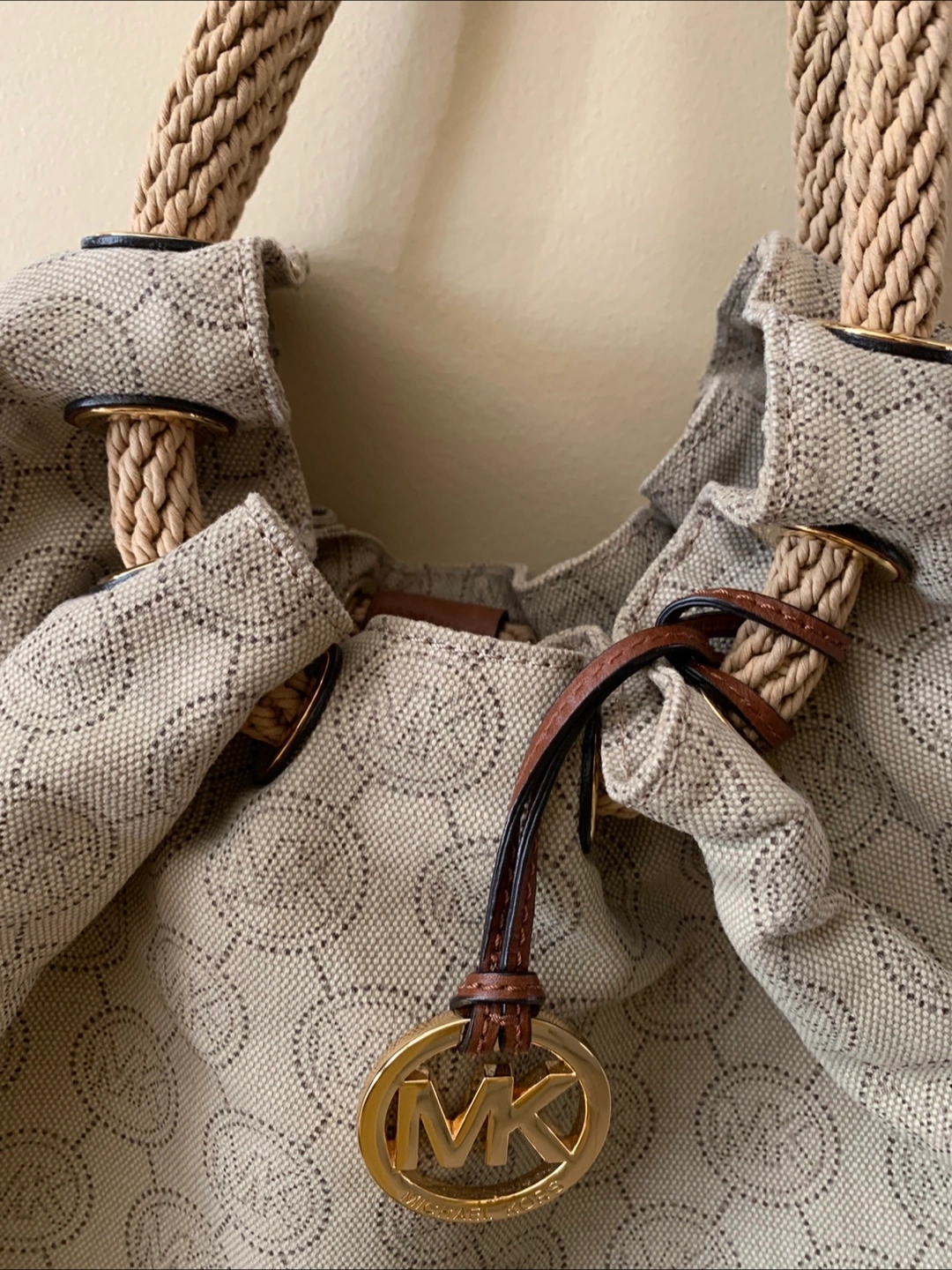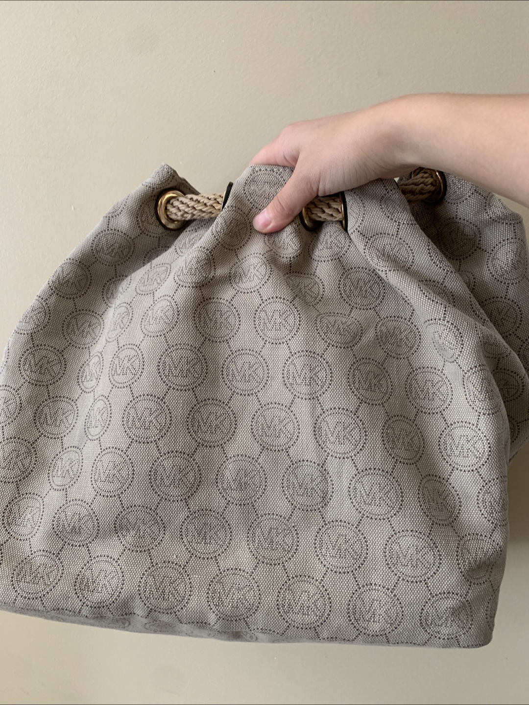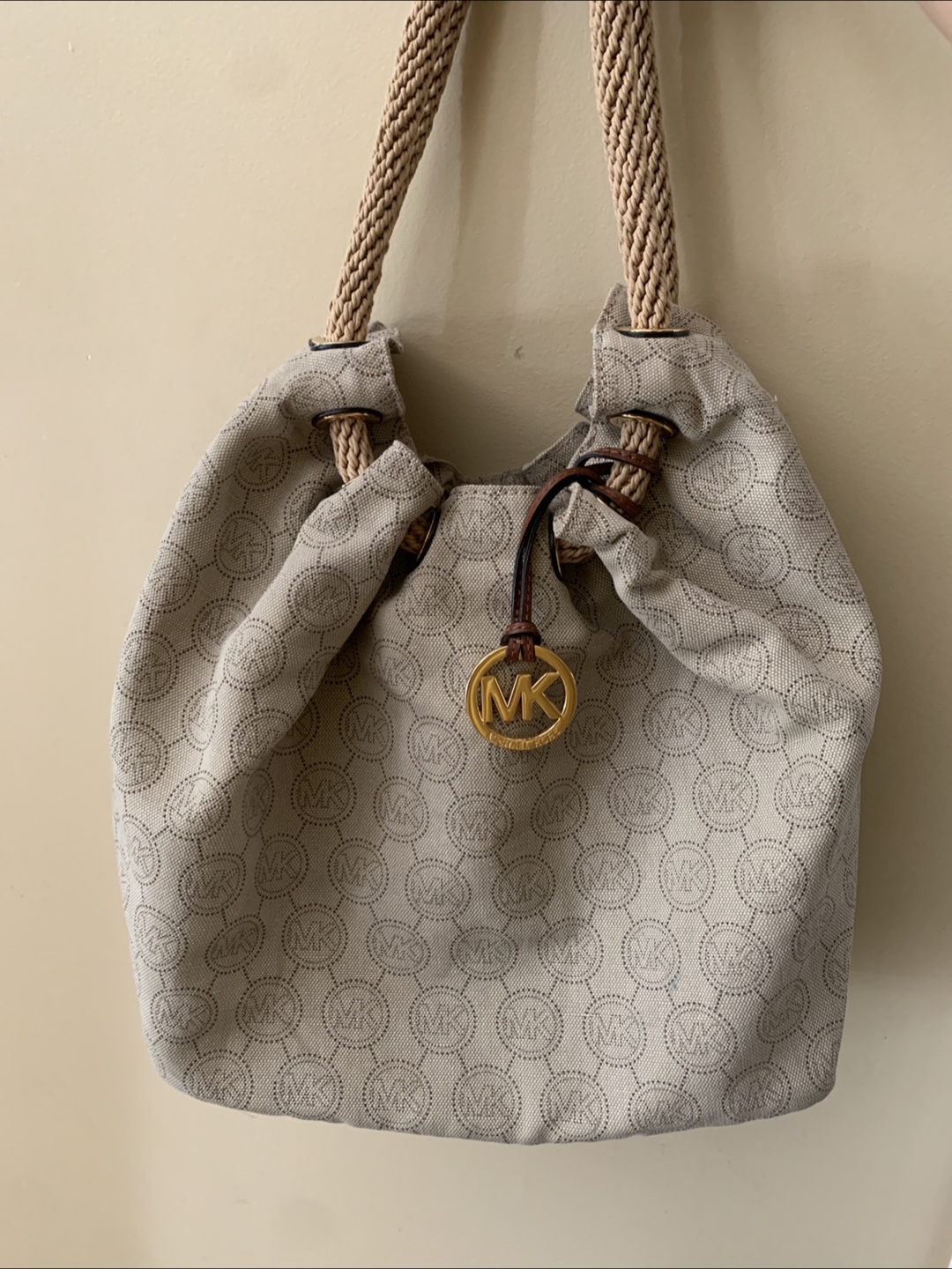 This is a beige Michael Kors tote bag. It features a unique MK logo pattern throughout the exterior. Have only worn once or twice when bought with no stains or wear/tear flaws!