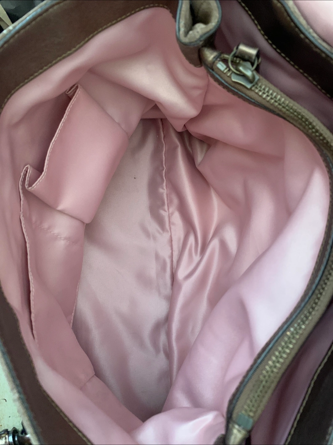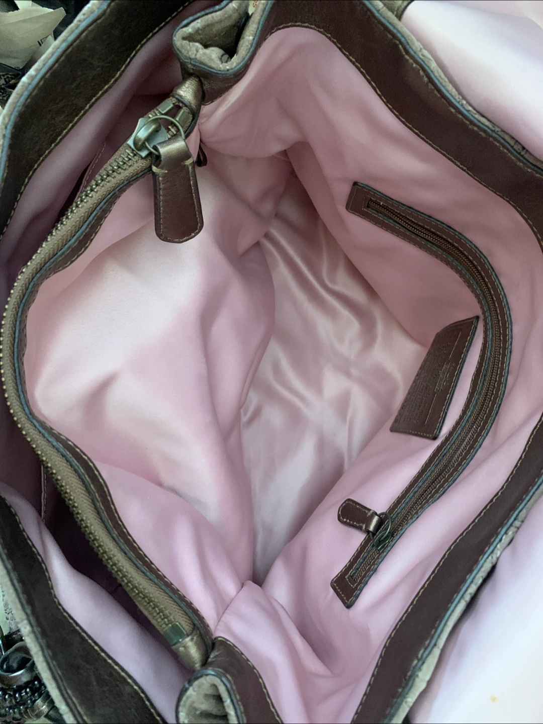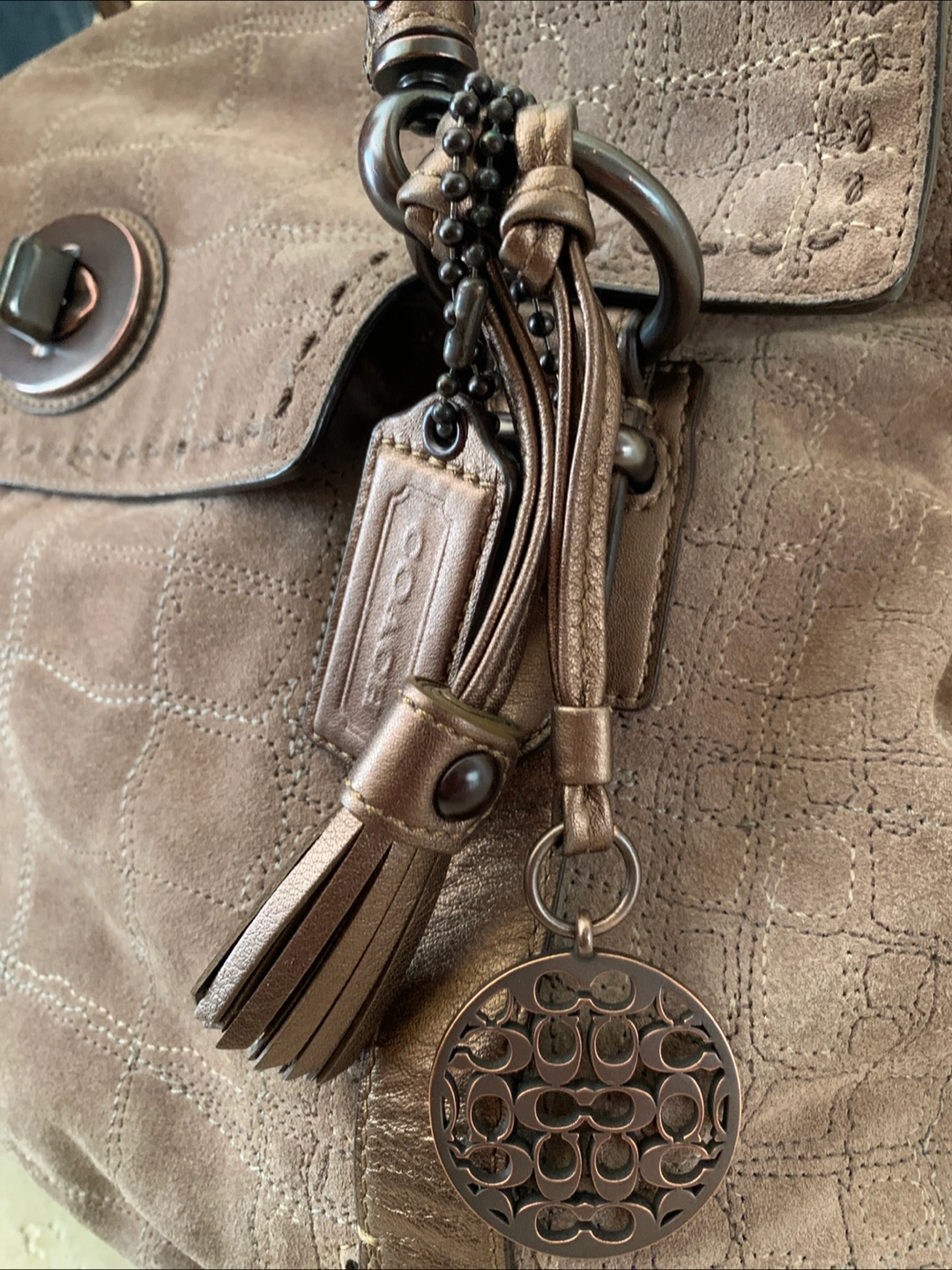 This is a Coach tote bag made of suede leather. It's in great condition with a bronze colour and a very elegant pink interior. It's a stylish and functional bag for everyday use! Comes with a dust bag! :)