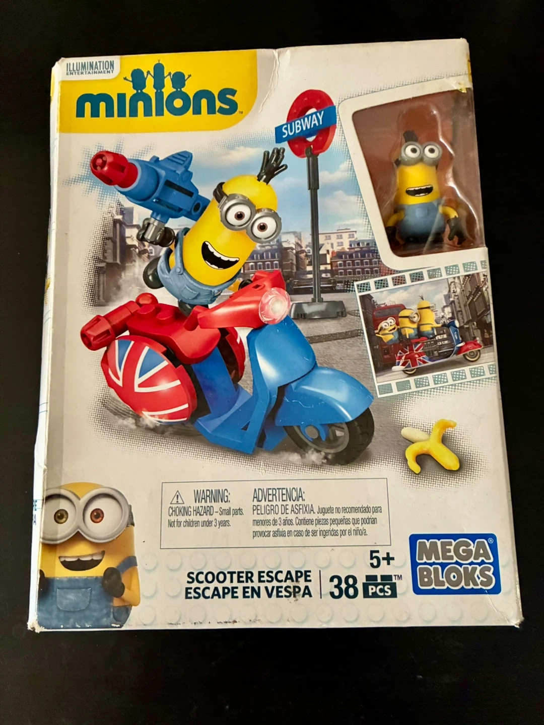 Selling a Mega Bloks Minions Scooter Escape in Vespa set, which includes 38 pieces for building a fun scooter scene with a Minion figure. Recommended for ages 5 and up. New, but box is dented.