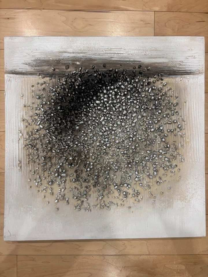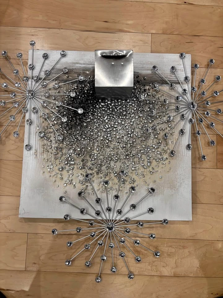 Make a whole wall shine ✨ Includes a square 3D metallic textured canvas + crystal starburst wall accents (as pictured). Modern, neutral silver/white—catches the light beautifully. Excellent condition, ready to hang.