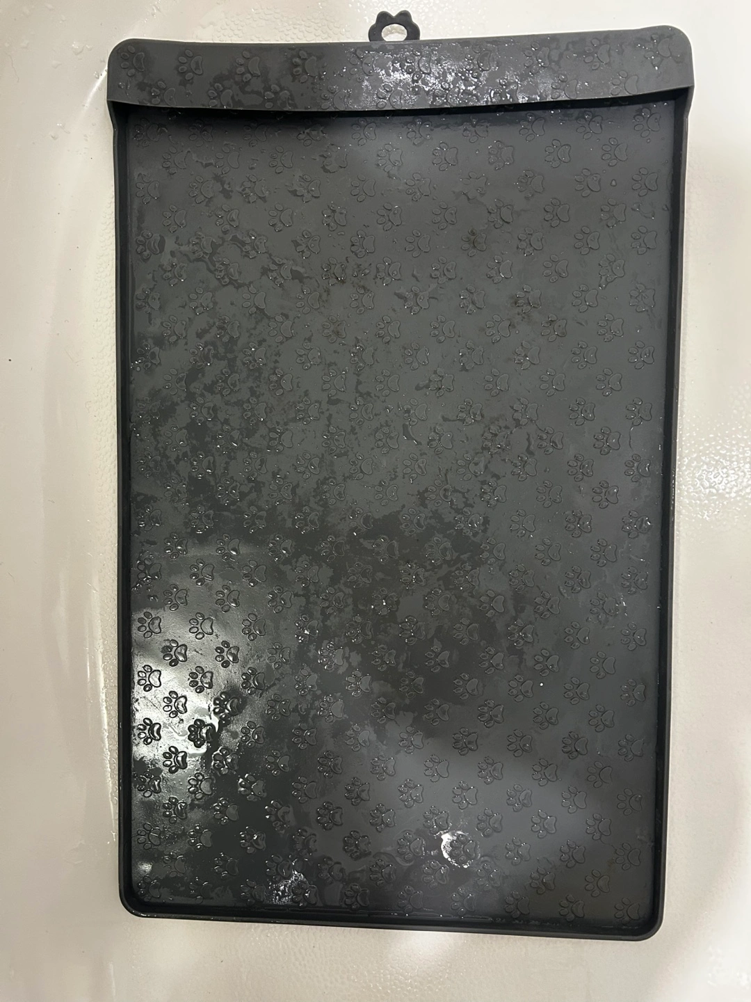 Pet food mat with paw prints on it. It needs a proper clean, but is otherwise in good condition and ready to use for your furry friend!