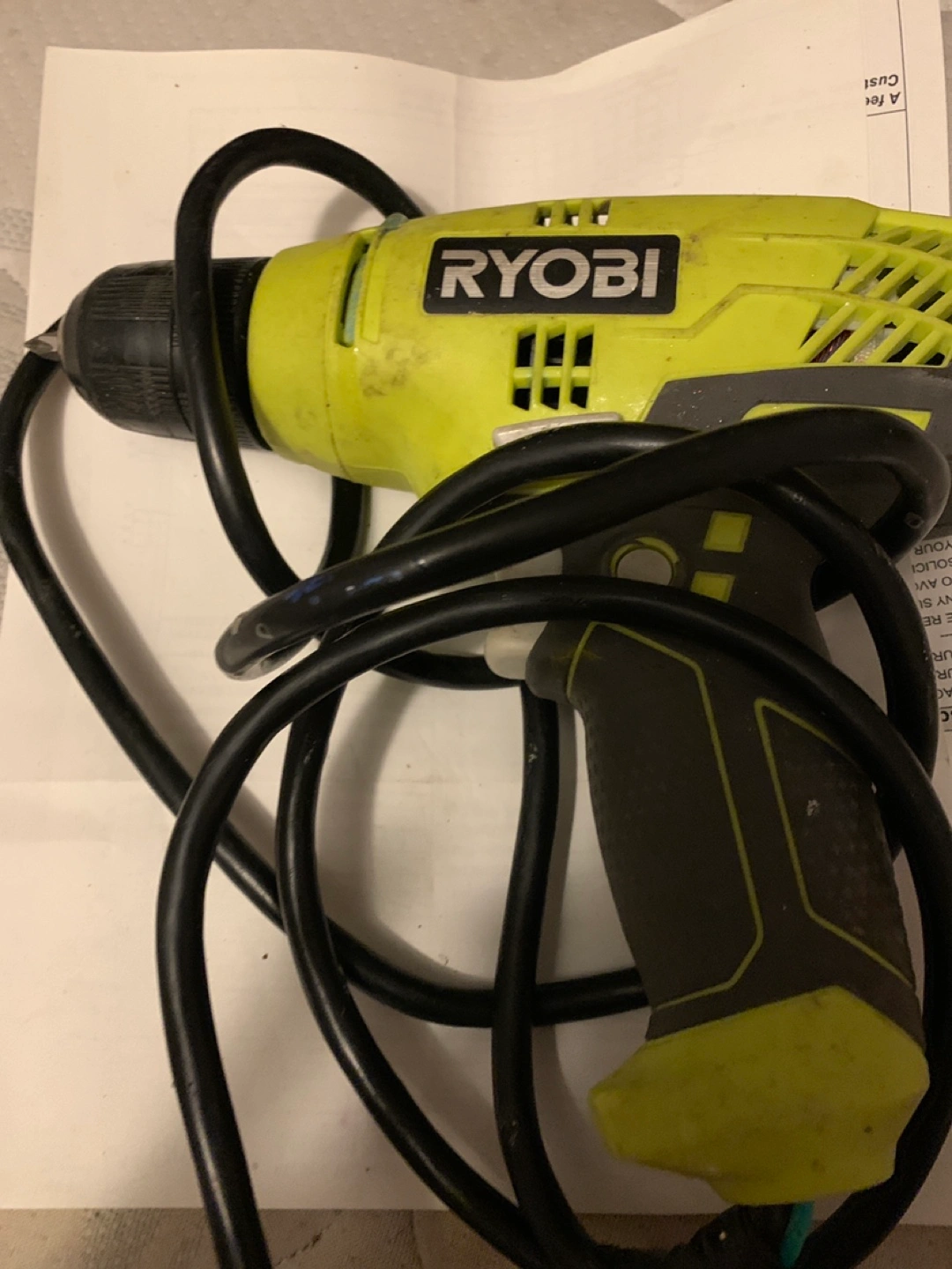 Selling a Ryobi corded drill. It shows some signs of use, but it's still functional. The drill is yellow and grey with a black cord. Great for various DIY projects around the house!