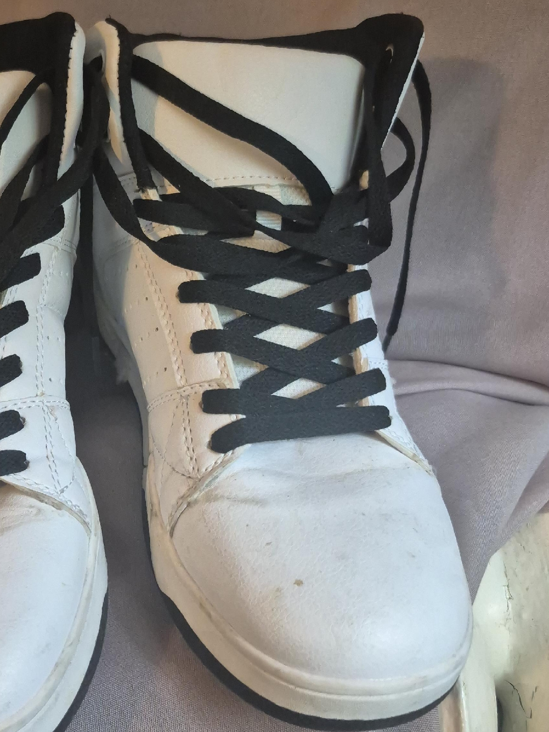 Selling a pair of white high-top sneakers. They have black laces and a classic look. Great for everyday wear!